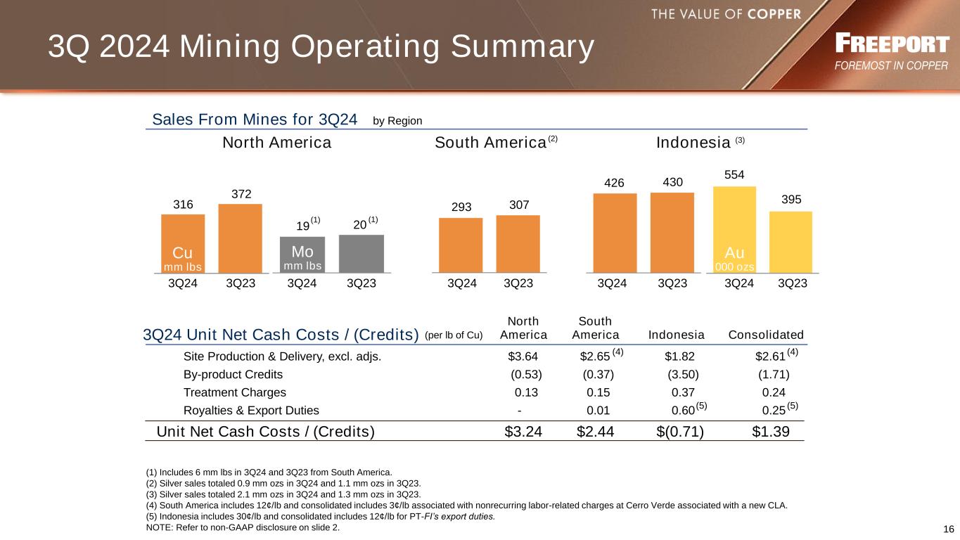 15 Financial Highlights Copper Consolidated Volumes, excluding purchases (mm lbs) 1,035 1,109 Average Realization (per lb) $ 4.30 $ 3.80 Site Production & Delivery Costs (per lb) $ 2.61 $ 2.27 Unit Net Cash Costs (per lb) $ 1.39 $ 1.73 Gold Consolidated Volumes (000’s ozs) 558 399 Average Realization (per oz) $2,568 $1,898 Molybdenum Consolidated Volumes (mm lbs) 19 20 Average Realization (per lb) $22.88 $23.71 3Q24 (1) Includes 3¢/lb associated with nonrecurring labor-related charges at Cerro Verde associated with a new CLA. (2) Includes working capital and other uses of <$0.1 bn for 3Q24 and $0.5 bn for 3Q23. (3) Includes $3.0 bn in senior notes issued by PT-FI and 3Q24 also includes $0.25 bn in borrowings under the PT-FI revolver. (4) Excludes $1.0 bn at 9/30/24 and $0.5 bn at 9/30/23 of current restricted cash associated with a portion of PT-FI's export proceeds required to be temporarily deposited in Indonesia banks. NOTE: Refer to non-GAAP disclosure on slide 2. Revenues $ 6.8 $ 5.8 Net Income Attributable to Common Stock $ 0.5 $ 0.5 Diluted Net Income Per Share $ 0.36 $ 0.31 Operating Cash Flows $ 1.9 $ 1.2 Capital Expenditures $ 1.2 $ 1.2 Total Debt $ 9.7 $ 9.4 Consolidated Cash and Cash Equivalents $ 5.0 $ 5.7 (2) (in billions, except per share amounts) Sales Data Financial Results 3Q23 (3) (4) (1)