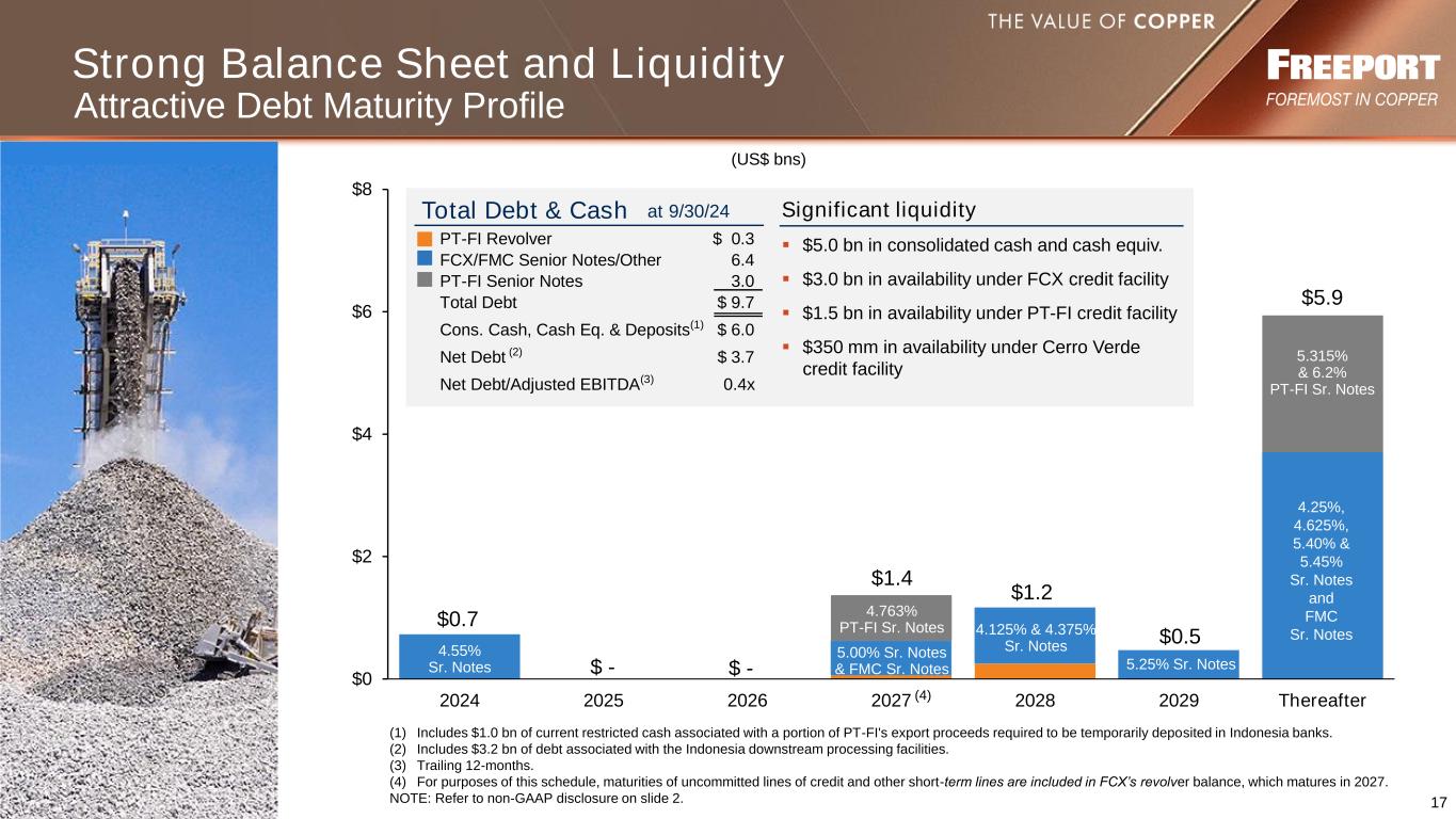 16 3Q 2024 Mining Operating Summary (1) Includes 6 mm lbs in 3Q24 and 3Q23 from South America. (2) Silver sales totaled 0.9 mm ozs in 3Q24 and 1.1 mm ozs in 3Q23. (3) Silver sales totaled 2.1 mm ozs in 3Q24 and 1.3 mm ozs in 3Q23. (4) South America includes 12¢/lb and consolidated includes 3¢/lb associated with nonrecurring labor-related charges at Cerro Verde associated with a new CLA. (5) Indonesia includes 30¢/lb and consolidated includes 12¢/lb for PT-FI’s export duties. NOTE: Refer to non-GAAP disclosure on slide 2. Site Production & Delivery, excl. adjs. $3.64 $2.65 $1.82 $2.61 By-product Credits (0.53) (0.37) (3.50) (1.71) Treatment Charges 0.13 0.15 0.37 0.24 Royalties & Export Duties - 0.01 0.60 0.25 Unit Net Cash Costs / (Credits) $3.24 $2.44 $(0.71) $1.39 North South America America Indonesia Consolidated(per lb of Cu)3Q24 Unit Net Cash Costs / (Credits) North America 2019 (1) Mo mm lbs 372 316 3Q24 3Q23 Cu mm lbs Indonesia (3) 430426 395 554 South America 293 307 by Region Au 000 ozs Sales From Mines for 3Q24 3Q24 3Q23 3Q24 3Q23 3Q24 3Q233Q24 3Q23 (2) (5) (1) (4) (4) (5)