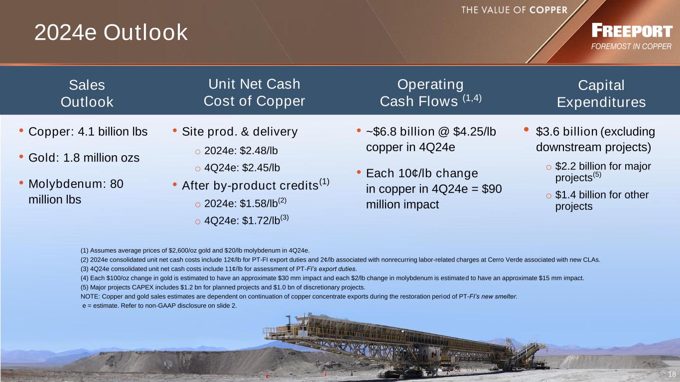 17 $0 $2 $4 $6 $8 2024 2025 2026 2027 2028 2029 Thereafter Strong Balance Sheet and Liquidity (US$ bns) $5.9 4.25%, 4.625%, 5.40% & 5.45% Sr. Notes and FMC Sr. Notes $0.7 4.55% Sr. Notes PT-FI Revolver $ 0.3 FCX/FMC Senior Notes/Other 6.4 PT-FI Senior Notes 3.0 Total Debt $ 9.7 Cons. Cash, Cash Eq. & Deposits(1) $ 6.0 Net Debt (2) $ 3.7 Net Debt/Adjusted EBITDA(3) 0.4x $ - at 9/30/24Total Debt & Cash $ - $1.4 (1) Includes $1.0 bn of current restricted cash associated with a portion of PT-FI's export proceeds required to be temporarily deposited in Indonesia banks. (2) Includes $3.2 bn of debt associated with the Indonesia downstream processing facilities. (3) Trailing 12-months. (4) For purposes of this schedule, maturities of uncommitted lines of credit and other short-term lines are included in FCX’s revolver balance, which matures in 2027. NOTE: Refer to non-GAAP disclosure on slide 2. (4) 5.00% Sr. Notes & FMC Sr. Notes 4.763% PT-FI Sr. Notes 5.315% & 6.2% PT-FI Sr. Notes Significant liquidity ▪ $5.0 bn in consolidated cash and cash equiv. ▪ $3.0 bn in availability under FCX credit facility ▪ $1.5 bn in availability under PT-FI credit facility ▪ $350 mm in availability under Cerro Verde credit facility 4.55% Sr. Notes 4.125% & 4.375% Sr. Notes $1.2 Attractive Debt Maturity Profile $0.5 5.25% Sr. Notes