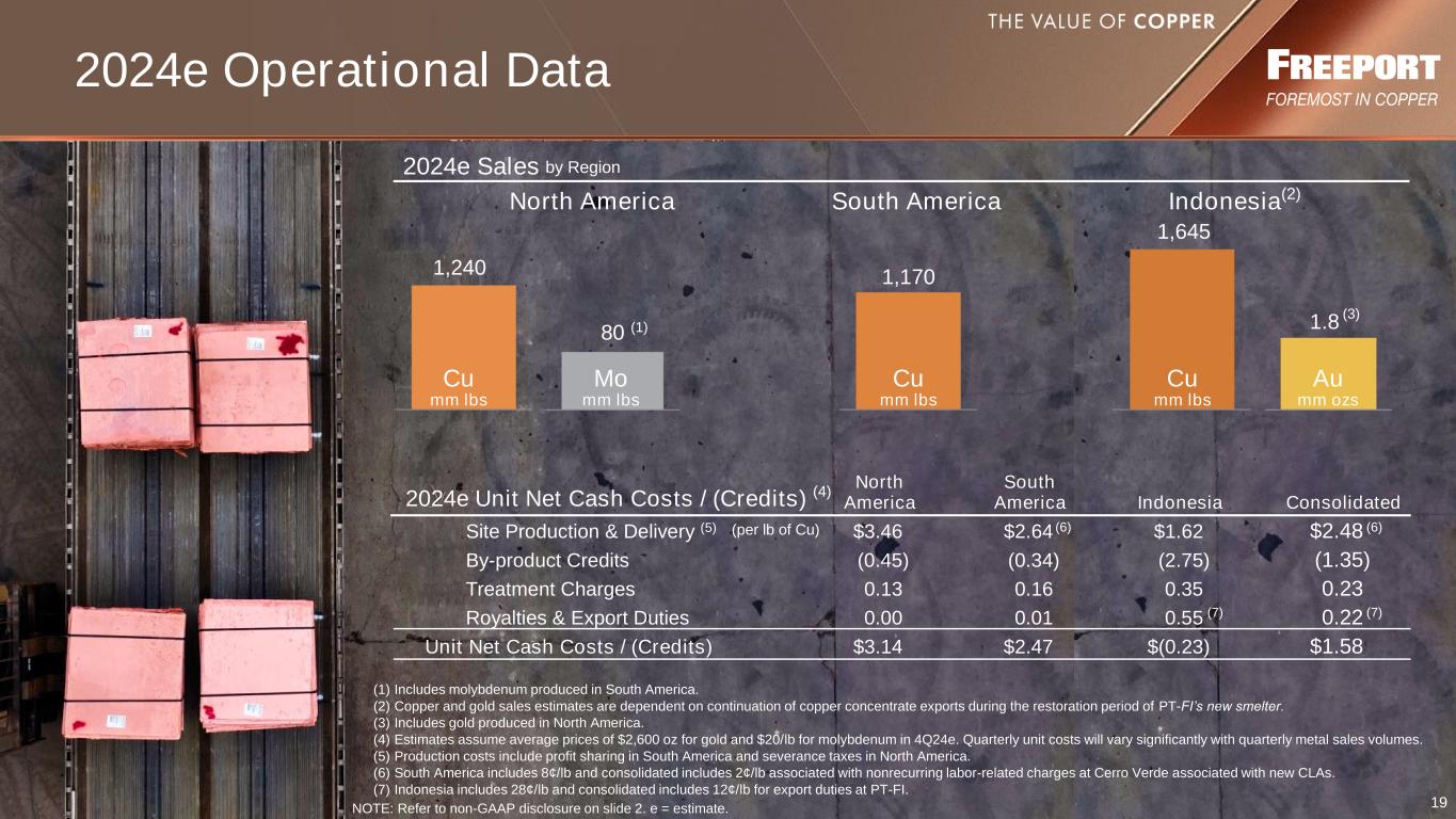 18 2024e Outlook Sales Outlook Unit Net Cash Cost of Copper Operating Cash Flows (1,4) Capital Expenditures (1) Assumes average prices of $2,600/oz gold and $20/lb molybdenum in 4Q24e. (2) 2024e consolidated unit net cash costs include 12¢/lb for PT-FI export duties and 2¢/lb associated with nonrecurring labor-related charges at Cerro Verde associated with new CLAs. (3) 4Q24e consolidated unit net cash costs include 11¢/lb for assessment of PT-FI’s export duties. (4) Each $100/oz change in gold is estimated to have an approximate $30 mm impact and each $2/lb change in molybdenum is estimated to have an approximate $15 mm impact. (5) Major projects CAPEX includes $1.2 bn for planned projects and $1.0 bn of discretionary projects. NOTE: Copper and gold sales estimates are dependent on continuation of copper concentrate exports during the restoration period of PT-FI’s new smelter. e = estimate. Refer to non-GAAP disclosure on slide 2. • Copper: 4.1 billion lbs • Gold: 1.8 million ozs • Molybdenum: 80 million lbs • ~$6.8 billion @ $4.25/lb copper in 4Q24e • Each 10¢/lb change in copper in 4Q24e = $90 million impact • Site prod. & delivery o 2024e: $2.48/lb o 4Q24e: $2.45/lb • After by-product credits(1) o 2024e: $1.58/lb(2) o 4Q24e: $1.72/lb(3) • $3.6 billion (excluding downstream projects) o $2.2 billion for major projects(5) o $1.4 billion for other projects