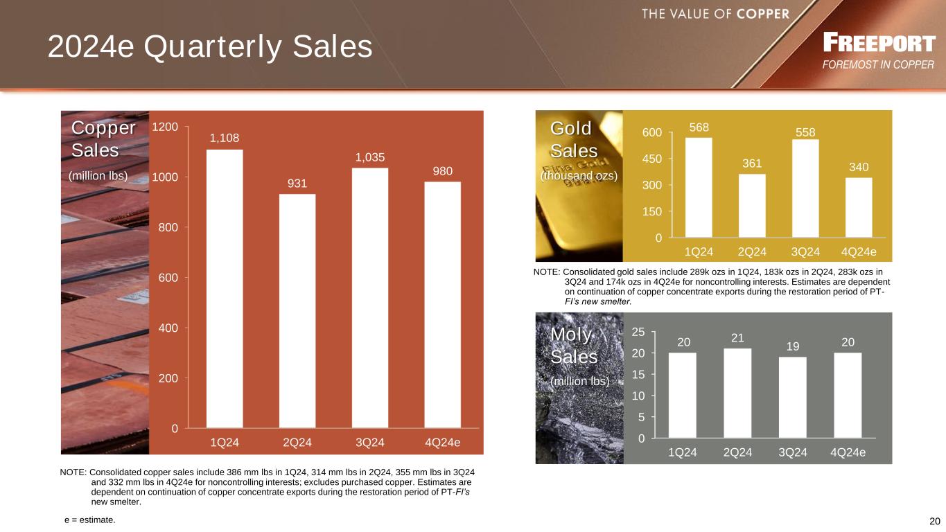 19 (1) (1) Includes molybdenum produced in South America. (2) Copper and gold sales estimates are dependent on continuation of copper concentrate exports during the restoration period of PT-FI’s new smelter. (3) Includes gold produced in North America. (4) Estimates assume average prices of $2,600 oz for gold and $20/lb for molybdenum in 4Q24e. Quarterly unit costs will vary significantly with quarterly metal sales volumes. (5) Production costs include profit sharing in South America and severance taxes in North America. (6) South America includes 8¢/lb and consolidated includes 2¢/lb associated with nonrecurring labor-related charges at Cerro Verde associated with new CLAs. (7) Indonesia includes 28¢/lb and consolidated includes 12¢/lb for export duties at PT-FI. 1,170 80 1,240 1,645 1.8 (3) North America Indonesia(2)South America by Region2024e Sales Mo mm lbs Cu mm lbs Au mm ozs (per lb of Cu)Site Production & Delivery (5) $3.46 $2.64 $1.62 $2.48 By-product Credits (0.45) (0.34) (2.75) (1.35) Treatment Charges 0.13 0.16 0.35 0.23 Royalties & Export Duties 0.00 0.01 0.55 0.22 Unit Net Cash Costs / (Credits) $3.14 $2.47 $(0.23) $1.58 2024e Unit Net Cash Costs / (Credits) (4) North South America America Indonesia Consolidated Cu mm lbs Cu mm lbs NOTE: Refer to non-GAAP disclosure on slide 2. e = estimate. 2024e Operational Data (7) (7) (6)(6)