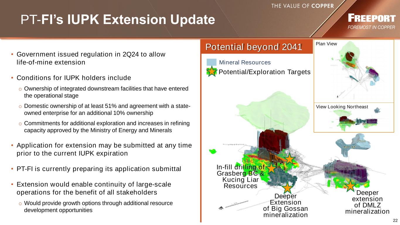 21 Metal Production, 2023 – 2028e 1.7 1.8 1.6 1.7 1.7 1.6 2.0 1.9 1.6 1.5 1.5 1.4 2023 2024e 2025e 2026e 2027e 2028e Cu bn lbs Au mm ozs Total: 8.4 billion lbs copper Annual Average: ~1.7 billion lbs 2024e – 2028e Copper Total: 7.9 million ozs gold Annual Average: ~1.6 million ozs 2024e – 2028e Gold Grasberg Minerals District Mine Plan NOTE: Amounts are projections. Timing of annual production will depend on a number of factors, including operational performance, the continuation of copper concentrate exports during the restoration period of PT-FI’s new smelter, and other factors. FCX’s economic interest in PT-FI is 48.76%. PT-FI expects to defer a portion of production in inventory until final sale upon ramp up of its new downstream processing facilities. This is not expected to result in a significant change in PT-FI's economics but will impact the timing of PT-FI's sales. e = estimate.