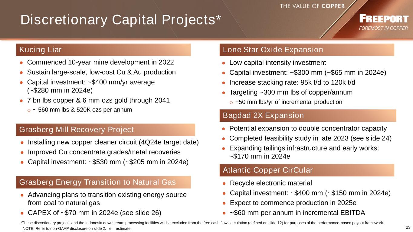 22 PT-FI’s IUPK Extension Update Potential beyond 2041 Plan View View Looking Northeast Dom GBT OP Mineral Resources Deeper Extension of Big Gossan mineralization In-fill drilling of Grasberg BC & Kucing Liar Resources Deeper extension of DMLZ mineralization Potential/Exploration Targets • Government issued regulation in 2Q24 to allow life-of-mine extension • Conditions for IUPK holders include o Ownership of integrated downstream facilities that have entered the operational stage o Domestic ownership of at least 51% and agreement with a state- owned enterprise for an additional 10% ownership o Commitments for additional exploration and increases in refining capacity approved by the Ministry of Energy and Minerals • Application for extension may be submitted at any time prior to the current IUPK expiration • PT-FI is currently preparing its application submittal • Extension would enable continuity of large-scale operations for the benefit of all stakeholders o Would provide growth options through additional resource development opportunities