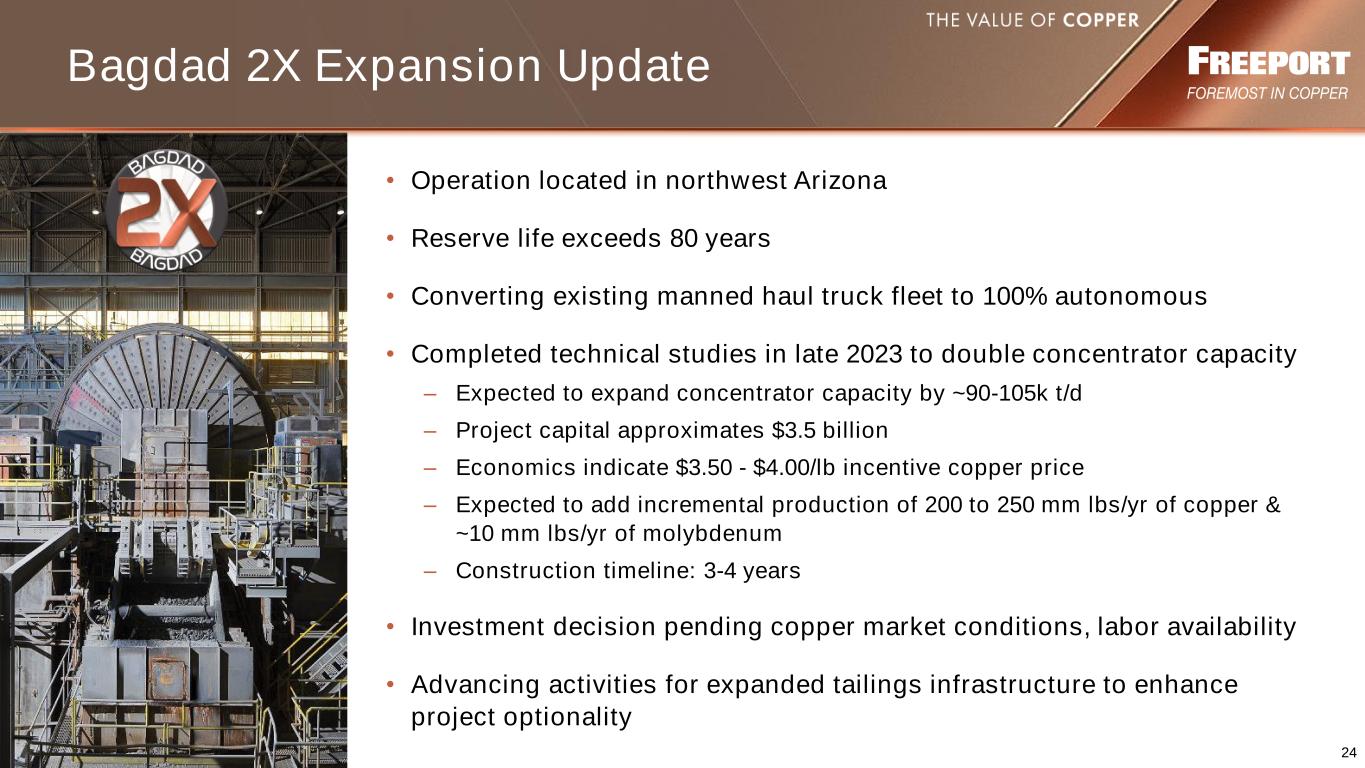 23 Discretionary Capital Projects* ● Commenced 10-year mine development in 2022 ● Sustain large-scale, low-cost Cu & Au production ● Capital investment: ~$400 mm/yr average (~$280 mm in 2024e) ● 7 bn lbs copper & 6 mm ozs gold through 2041 o ~ 560 mm lbs & 520K ozs per annum Kucing Liar ● Recycle electronic material ● Capital investment: ~$400 mm (~$150 mm in 2024e) ● Expect to commence production in 2025e ● ~$60 mm per annum in incremental EBITDA Atlantic Copper CirCular Lone Star Oxide Expansion ● Low capital intensity investment ● Capital investment: ~$300 mm (~$65 mm in 2024e) ● Increase stacking rate: 95k t/d to 120k t/d ● Targeting ~300 mm lbs of copper/annum o +50 mm lbs/yr of incremental production Grasberg Mill Recovery Project ● Installing new copper cleaner circuit (4Q24e target date) ● Improved Cu concentrate grades/metal recoveries ● Capital investment: ~$530 mm (~$205 mm in 2024e) *These discretionary projects and the Indonesia downstream processing facilities will be excluded from the free cash flow calculation (defined on slide 12) for purposes of the performance-based payout framework. NOTE: Refer to non-GAAP disclosure on slide 2. e = estimate. ● Potential expansion to double concentrator capacity ● Completed feasibility study in late 2023 (see slide 24) ● Expanding tailings infrastructure and early works: ~$170 mm in 2024e Bagdad 2X Expansion Grasberg Energy Transition to Natural Gas ● Advancing plans to transition existing energy source from coal to natural gas ● CAPEX of ~$70 mm in 2024e (see slide 26)