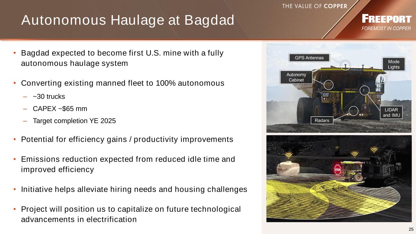 24 Bagdad 2X Expansion Update • Operation located in northwest Arizona • Reserve life exceeds 80 years • Converting existing manned haul truck fleet to 100% autonomous • Completed technical studies in late 2023 to double concentrator capacity – Expected to expand concentrator capacity by ~90-105k t/d – Project capital approximates $3.5 billion – Economics indicate $3.50 - $4.00/lb incentive copper price – Expected to add incremental production of 200 to 250 mm lbs/yr of copper & ~10 mm lbs/yr of molybdenum – Construction timeline: 3-4 years • Investment decision pending copper market conditions, labor availability • Advancing activities for expanded tailings infrastructure to enhance project optionality