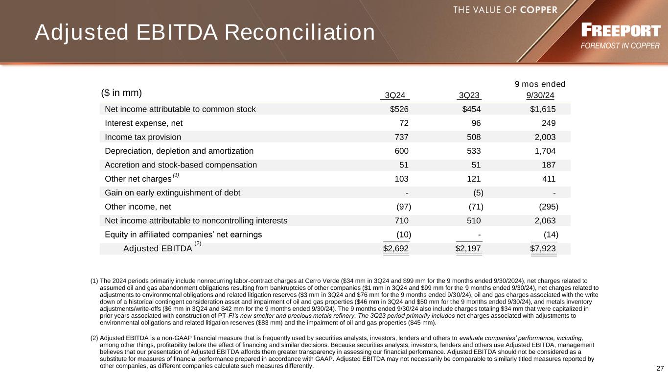 27 ($ in mm) 9 mos ended 3Q24 3Q23 9/30/24 Net income attributable to common stock $526 $454 $1,615 Interest expense, net 72 96 249 Income tax provision 737 508 2,003 Depreciation, depletion and amortization 600 533 1,704 Accretion and stock-based compensation 51 51 187 Other net charges (1) 103 121 411 Gain on early extinguishment of debt - (5) - Other income, net (97) (71) (295) Net income attributable to noncontrolling interests 710 510 2,063 Equity in affiliated companies’ net earnings (10) - (14) Adjusted EBITDA (2) $2,692 $2,197 $7,923 (1) The 2024 periods primarily include nonrecurring labor-contract charges at Cerro Verde ($34 mm in 3Q24 and $99 mm for the 9 months ended 9/30/2024), net charges related to assumed oil and gas abandonment obligations resulting from bankruptcies of other companies ($1 mm in 3Q24 and $99 mm for the 9 months ended 9/30/24), net charges related to adjustments to environmental obligations and related litigation reserves ($3 mm in 3Q24 and $76 mm for the 9 months ended 9/30/24), oil and gas charges associated with the write down of a historical contingent consideration asset and impairment of oil and gas properties ($46 mm in 3Q24 and $50 mm for the 9 months ended 9/30/24), and metals inventory adjustments/write-offs ($6 mm in 3Q24 and $42 mm for the 9 months ended 9/30/24). The 9 months ended 9/30/24 also include charges totaling $34 mm that were capitalized in prior years associated with construction of PT-FI’s new smelter and precious metals refinery. The 3Q23 period primarily includes net charges associated with adjustments to environmental obligations and related litigation reserves ($83 mm) and the impairment of oil and gas properties ($45 mm). (2) Adjusted EBITDA is a non-GAAP financial measure that is frequently used by securities analysts, investors, lenders and others to evaluate companies’ performance, including, among other things, profitability before the effect of financing and similar decisions. Because securities analysts, investors, lenders and others use Adjusted EBITDA, management believes that our presentation of Adjusted EBITDA affords them greater transparency in assessing our financial performance. Adjusted EBITDA should not be considered as a substitute for measures of financial performance prepared in accordance with GAAP. Adjusted EBITDA may not necessarily be comparable to similarly titled measures reported by other companies, as different companies calculate such measures differently. Adjusted EBITDA Reconciliation