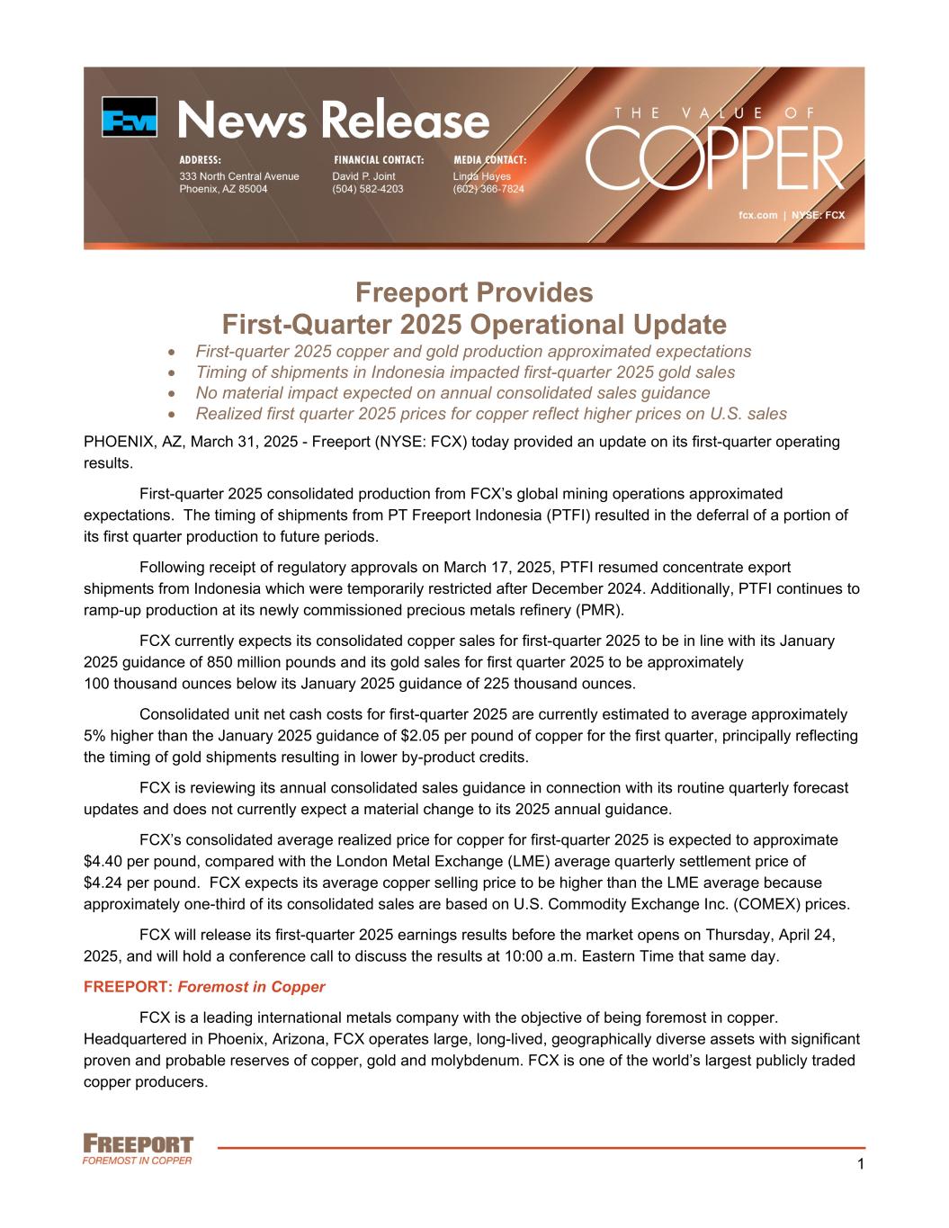 1 Freeport Provides First-Quarter 2025 Operational Update • First-quarter 2025 copper and gold production approximated expectations • Timing of shipments in Indonesia impacted first-quarter 2025 gold sales • No material impact expected on annual consolidated sales guidance • Realized first quarter 2025 prices for copper reflect higher prices on U.S. sales PHOENIX, AZ, March 31, 2025 - Freeport (NYSE: FCX) today provided an update on its first-quarter operating results. First-quarter 2025 consolidated production from FCX’s global mining operations approximated expectations. The timing of shipments from PT Freeport Indonesia (PTFI) resulted in the deferral of a portion of its first quarter production to future periods. Following receipt of regulatory approvals on March 17, 2025, PTFI resumed concentrate export shipments from Indonesia which were temporarily restricted after December 2024. Additionally, PTFI continues to ramp-up production at its newly commissioned precious metals refinery (PMR). FCX currently expects its consolidated copper sales for first-quarter 2025 to be in line with its January 2025 guidance of 850 million pounds and its gold sales for first quarter 2025 to be approximately 100 thousand ounces below its January 2025 guidance of 225 thousand ounces. Consolidated unit net cash costs for first-quarter 2025 are currently estimated to average approximately 5% higher than the January 2025 guidance of $2.05 per pound of copper for the first quarter, principally reflecting the timing of gold shipments resulting in lower by-product credits. FCX is reviewing its annual consolidated sales guidance in connection with its routine quarterly forecast updates and does not currently expect a material change to its 2025 annual guidance. FCX’s consolidated average realized price for copper for first-quarter 2025 is expected to approximate $4.40 per pound, compared with the London Metal Exchange (LME) average quarterly settlement price of $4.24 per pound. FCX expects its average copper selling price to be higher than the LME average because approximately one-third of its consolidated sales are based on U.S. Commodity Exchange Inc. (COMEX) prices. FCX will release its first-quarter 2025 earnings results before the market opens on Thursday, April 24, 2025, and will hold a conference call to discuss the results at 10:00 a.m. Eastern Time that same day. FREEPORT: Foremost in Copper FCX is a leading international metals company with the objective of being foremost in copper. Headquartered in Phoenix, Arizona, FCX operates large, long-lived, geographically diverse assets with significant proven and probable reserves of copper, gold and molybdenum. FCX is one of the world’s largest publicly traded copper producers.