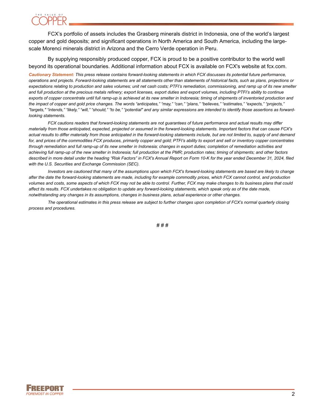 {N4163160.1} 2 FCX’s portfolio of assets includes the Grasberg minerals district in Indonesia, one of the world’s largest copper and gold deposits; and significant operations in North America and South America, including the large- scale Morenci minerals district in Arizona and the Cerro Verde operation in Peru. By supplying responsibly produced copper, FCX is proud to be a positive contributor to the world well beyond its operational boundaries. Additional information about FCX is available on FCX's website at fcx.com. Cautionary Statement: This press release contains forward-looking statements in which FCX discusses its potential future performance, operations and projects. Forward-looking statements are all statements other than statements of historical facts, such as plans, projections or expectations relating to production and sales volumes; unit net cash costs; PTFI’s remediation, commissioning, and ramp up of its new smelter and full production at the precious metals refinery; export licenses, export duties and export volumes, including PTFI’s ability to continue exports of copper concentrate until full ramp-up is achieved at its new smelter in Indonesia; timing of shipments of inventoried production and the impact of copper and gold price changes. The words “anticipates,” “may,” “can,” “plans,” “believes,” “estimates,” “expects,” “projects,” "targets," “intends,” “likely,” “will,” “should,” “to be,” “potential" and any similar expressions are intended to identify those assertions as forward- looking statements. FCX cautions readers that forward-looking statements are not guarantees of future performance and actual results may differ materially from those anticipated, expected, projected or assumed in the forward-looking statements. Important factors that can cause FCX's actual results to differ materially from those anticipated in the forward-looking statements include, but are not limited to, supply of and demand for, and prices of the commodities FCX produces, primarily copper and gold; PTFI’s ability to export and sell or inventory copper concentrates through remediation and full ramp-up of its new smelter in Indonesia; changes in export duties; completion of remediation activities and achieving full ramp-up of the new smelter in Indonesia; full production at the PMR; production rates; timing of shipments; and other factors described in more detail under the heading “Risk Factors” in FCX's Annual Report on Form 10-K for the year ended December 31, 2024, filed with the U.S. Securities and Exchange Commission (SEC). Investors are cautioned that many of the assumptions upon which FCX's forward-looking statements are based are likely to change after the date the forward-looking statements are made, including for example commodity prices, which FCX cannot control, and production volumes and costs, some aspects of which FCX may not be able to control. Further, FCX may make changes to its business plans that could affect its results. FCX undertakes no obligation to update any forward-looking statements, which speak only as of the date made, notwithstanding any changes in its assumptions, changes in business plans, actual experience or other changes. The operational estimates in this press release are subject to further changes upon completion of FCX’s normal quarterly closing process and procedures. # # #