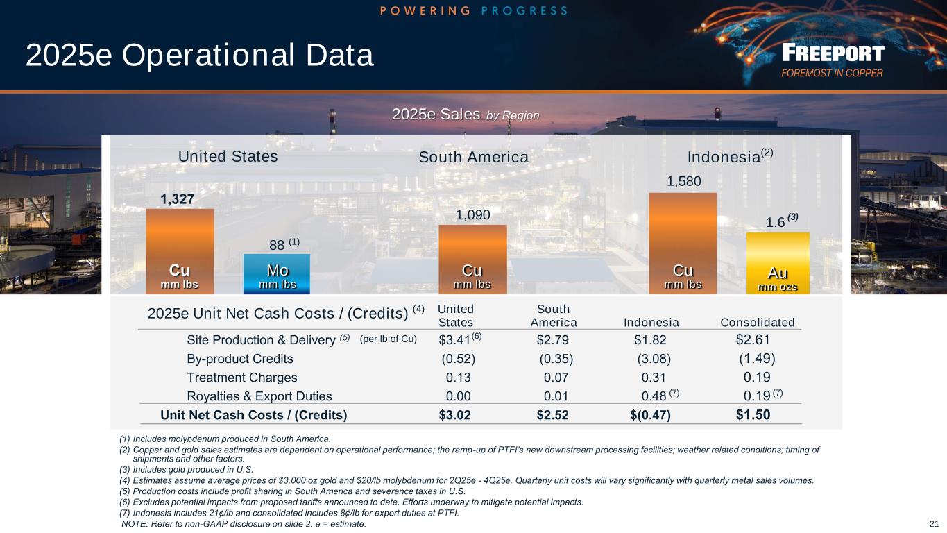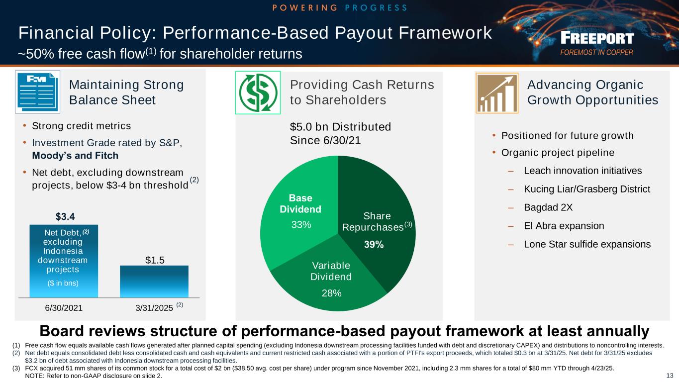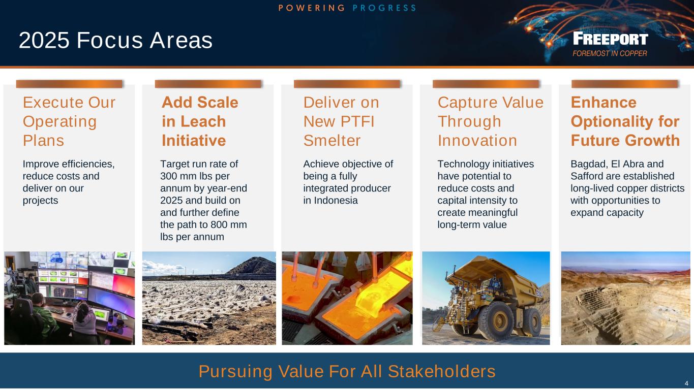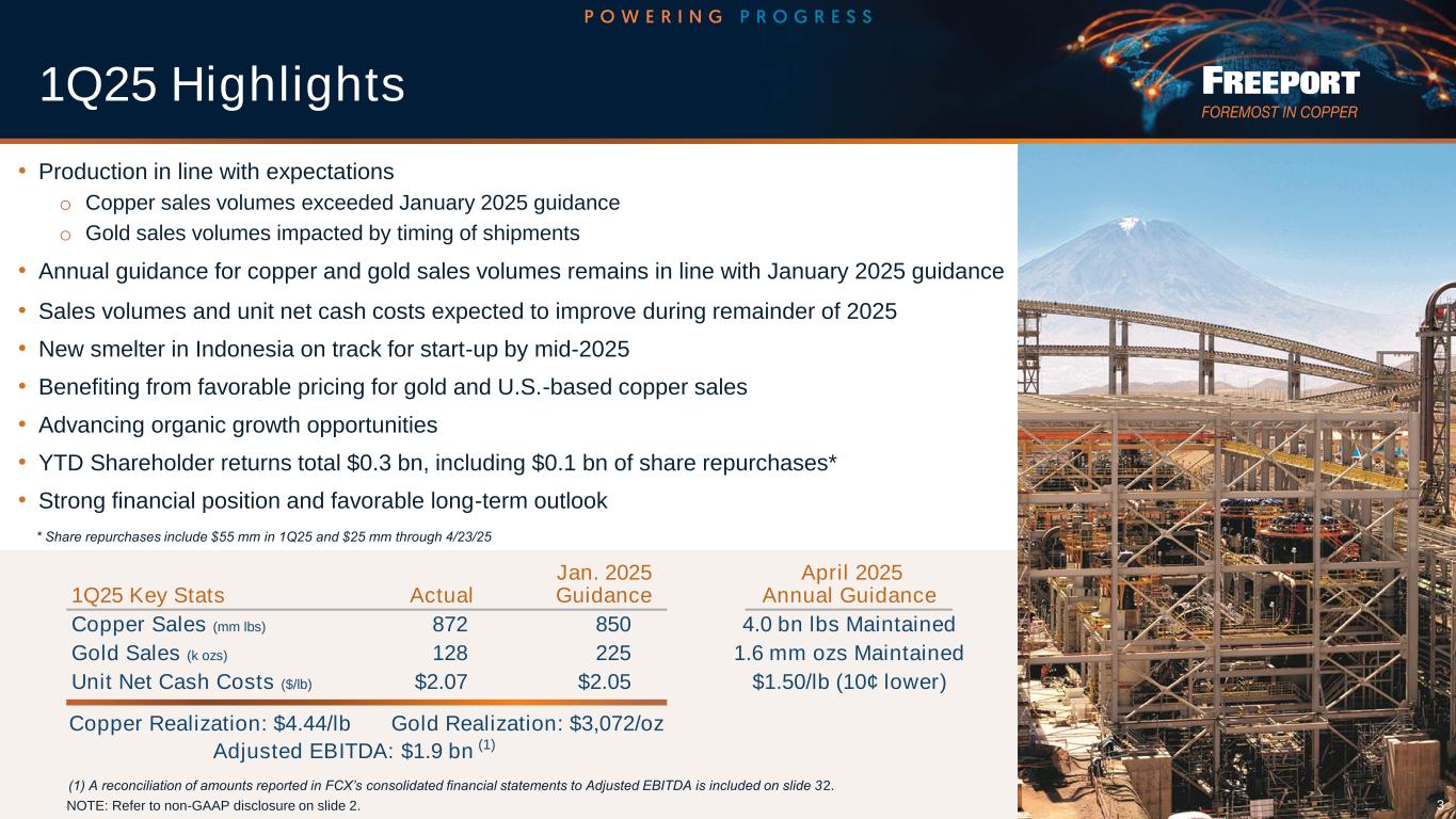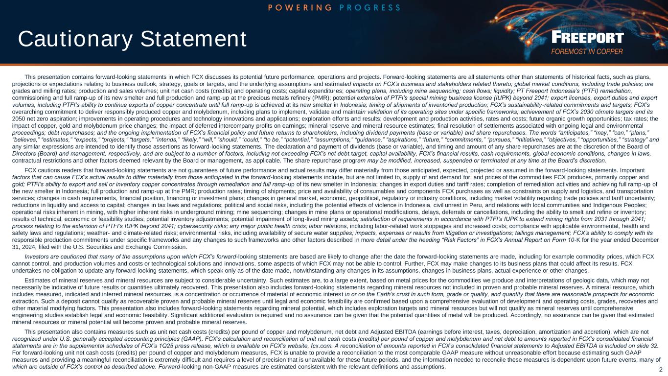 Cautionary Statement This presentation contains forward-looking statements in which FCX discusses its potential future performance, operations and projects. Forward-looking statements are all statements other than statements of historical facts, such as plans, projections or expectations relating to business outlook, strategy, goals or targets, and the underlying assumptions and estimated impacts on FCX’s business and stakeholders related thereto; global market conditions, including trade policies; ore grades and milling rates; production and sales volumes; unit net cash costs (credits) and operating costs; capital expenditures; operating plans, including mine sequencing; cash flows; liquidity; PT Freeport Indonesia’s (PTFI) remediation, commissioning and full ramp-up of its new smelter and full production and ramp-up at the precious metals refinery (PMR); potential extension of PTFI’s special mining business license (IUPK) beyond 2041; export licenses, export duties and export volumes, including PTFI’s ability to continue exports of copper concentrate until full ramp-up is achieved at its new smelter in Indonesia; timing of shipments of inventoried production; FCX’s sustainability-related commitments and targets; FCX’s overarching commitment to deliver responsibly produced copper and molybdenum, including plans to implement, validate and maintain validation of its operating sites under specific frameworks; achievement of FCX’s 2030 climate targets and its 2050 net zero aspiration; improvements in operating procedures and technology innovations and applications; exploration efforts and results; development and production activities, rates and costs; future organic growth opportunities; tax rates; the impact of copper, gold and molybdenum price changes; the impact of deferred intercompany profits on earnings; mineral reserve and mineral resource estimates; final resolution of settlements associated with ongoing legal and environmental proceedings; debt repurchases; and the ongoing implementation of FCX’s financial policy and future returns to shareholders, including dividend payments (base or variable) and share repurchases. The words “anticipates,” “may,” “can,” “plans,” “believes,” “estimates,” “expects,” “projects,” “targets,” “intends,” “likely,” “will,” “should,” “could,” “to be,” “potential,” “assumptions,” “guidance,” “aspirations,” “future,” “commitments,” “pursues,” “initiatives,” “objectives,” “opportunities,” “strategy” and any similar expressions are intended to identify those assertions as forward-looking statements. The declaration and payment of dividends (base or variable), and timing and amount of any share repurchases are at the discretion of the Board of Directors (Board) and management, respectively, and are subject to a number of factors, including not exceeding FCX’s net debt target, capital availability, FCX’s financial results, cash requirements, global economic conditions, changes in laws, contractual restrictions and other factors deemed relevant by the Board or management, as applicable. The share repurchase program may be modified, increased, suspended or terminated at any time at the Board’s discretion. FCX cautions readers that forward-looking statements are not guarantees of future performance and actual results may differ materially from those anticipated, expected, projected or assumed in the forward-looking statements. Important factors that can cause FCX’s actual results to differ materially from those anticipated in the forward-looking statements include, but are not limited to, supply of and demand for, and prices of the commodities FCX produces, primarily copper and gold; PTFI’s ability to export and sell or inventory copper concentrates through remediation and full ramp-up of its new smelter in Indonesia; changes in export duties and tariff rates; completion of remediation activities and achieving full ramp-up of the new smelter in Indonesia; full production and ramp-up at the PMR; production rates; timing of shipments; price and availability of consumables and components FCX purchases as well as constraints on supply and logistics, and transportation services; changes in cash requirements, financial position, financing or investment plans; changes in general market, economic, geopolitical, regulatory or industry conditions, including market volatility regarding trade policies and tariff uncertainty; reductions in liquidity and access to capital; changes in tax laws and regulations; political and social risks, including the potential effects of violence in Indonesia, civil unrest in Peru, and relations with local communities and Indigenous Peoples; operational risks inherent in mining, with higher inherent risks in underground mining; mine sequencing; changes in mine plans or operational modifications, delays, deferrals or cancellations, including the ability to smelt and refine or inventory; results of technical, economic or feasibility studies; potential inventory adjustments; potential impairment of long-lived mining assets; satisfaction of requirements in accordance with PTFI’s IUPK to extend mining rights from 2031 through 2041; process relating to the extension of PTFI’s IUPK beyond 2041; cybersecurity risks; any major public health crisis; labor relations, including labor-related work stoppages and increased costs; compliance with applicable environmental, health and safety laws and regulations; weather- and climate-related risks; environmental risks, including availability of secure water supplies; impacts, expenses or results from litigation or investigations; tailings management; FCX’s ability to comply with its responsible production commitments under specific frameworks and any changes to such frameworks and other factors described in more detail under the heading “Risk Factors” in FCX’s Annual Repo