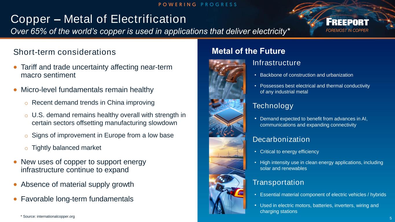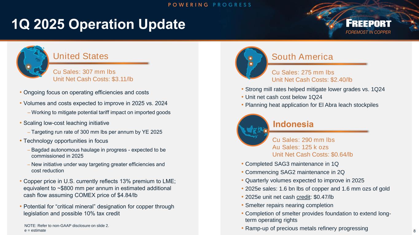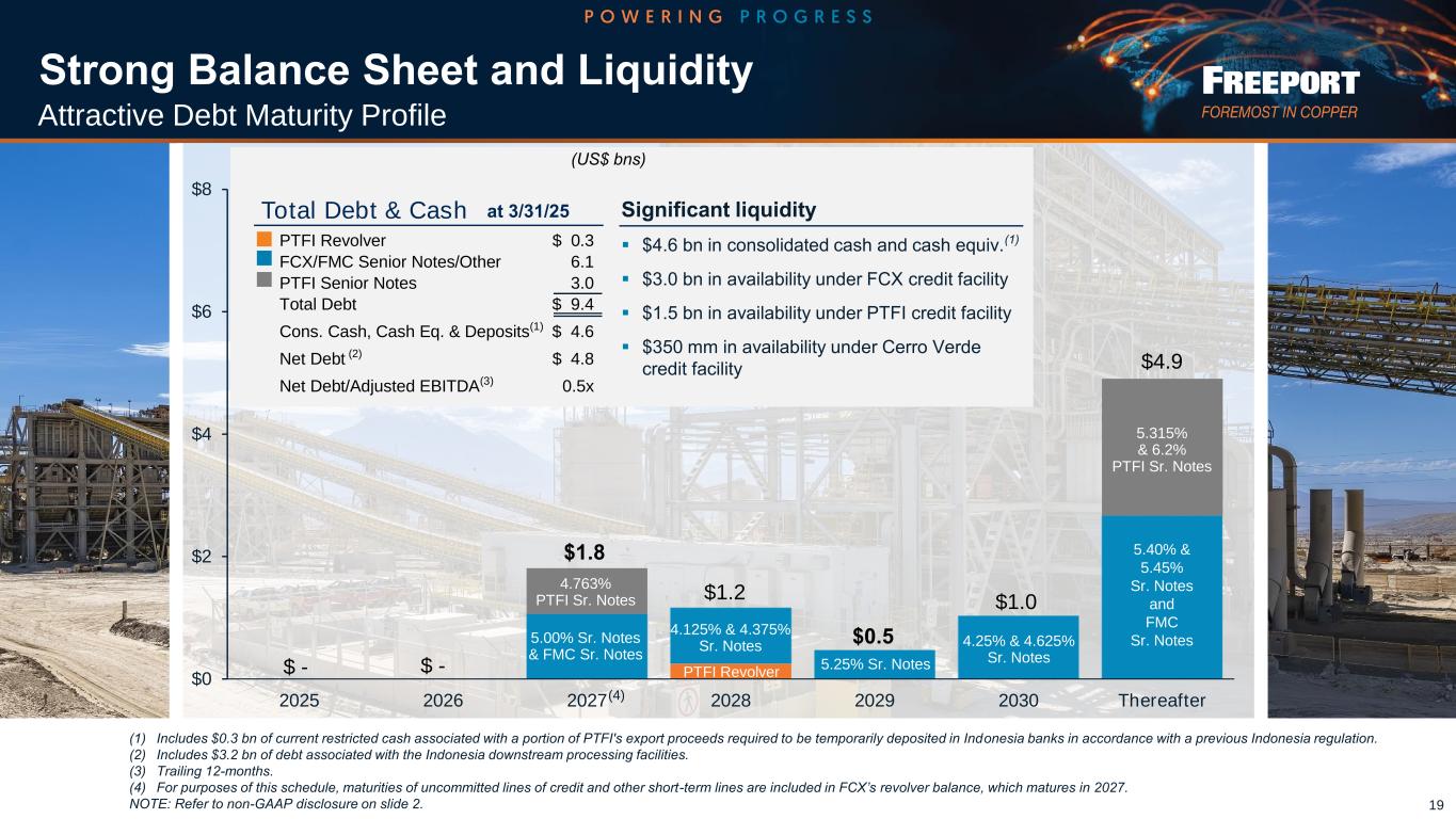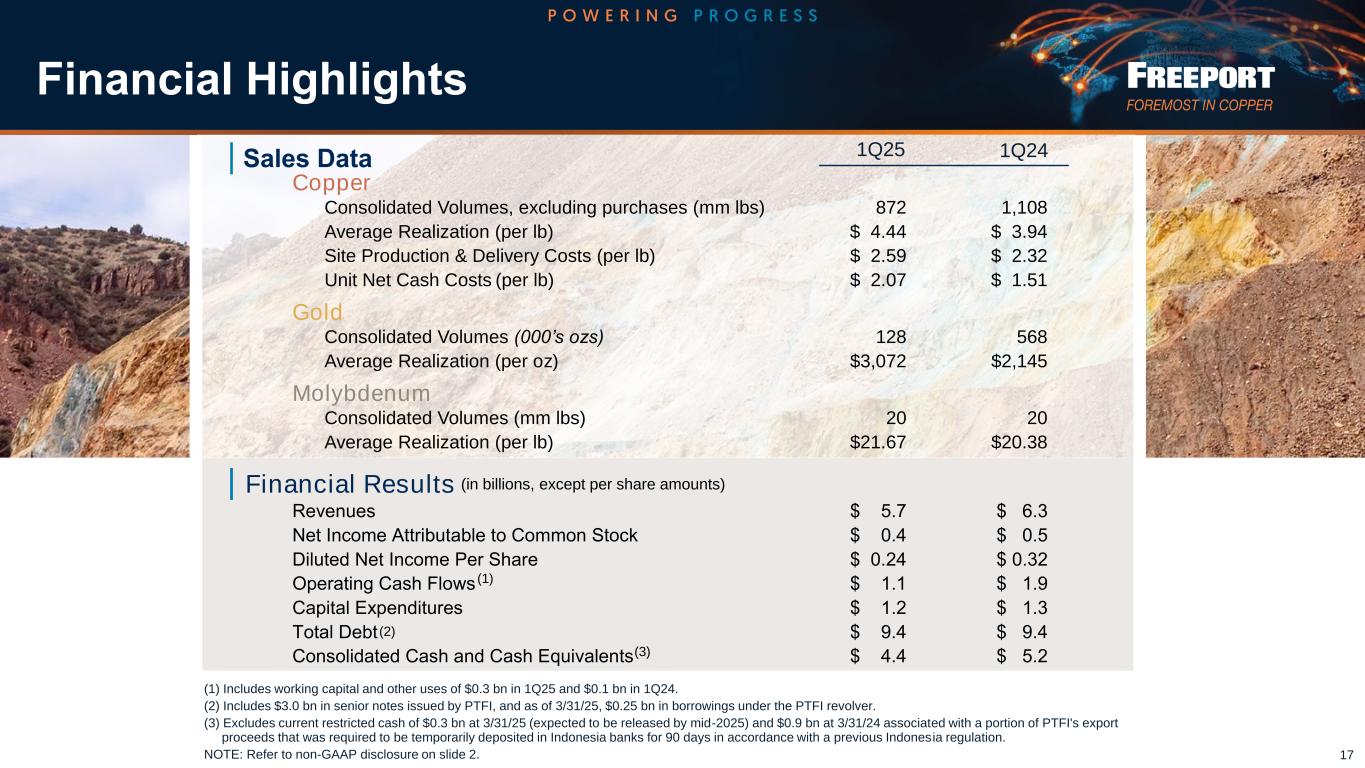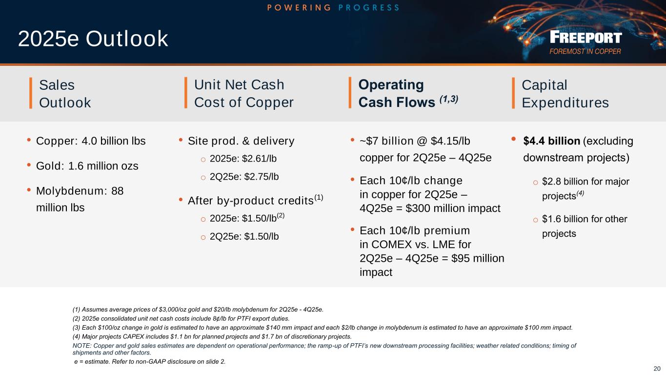 Cautionary Statement This presentation contains forward-looking statements in which FCX discusses its potential future performance, operations and projects. Forward-looking statements are all statements other than statements of historical facts, such as plans, projections or expectations relating to business outlook, strategy, goals or targets, and the underlying assumptions and estimated impacts on FCX’s business and stakeholders related thereto; global market conditions, including trade policies; ore grades and milling rates; production and sales volumes; unit net cash costs (credits) and operating costs; capital expenditures; operating plans, including mine sequencing; cash flows; liquidity; PT Freeport Indonesia’s (PTFI) remediation, commissioning and full ramp-up of its new smelter and full production and ramp-up at the precious metals refinery (PMR); potential extension of PTFI’s special mining business license (IUPK) beyond 2041; export licenses, export duties and export volumes, including PTFI’s ability to continue exports of copper concentrate until full ramp-up is achieved at its new smelter in Indonesia; timing of shipments of inventoried production; FCX’s sustainability-related commitments and targets; FCX’s overarching commitment to deliver responsibly produced copper and molybdenum, including plans to implement, validate and maintain validation of its operating sites under specific frameworks; achievement of FCX’s 2030 climate targets and its 2050 net zero aspiration; improvements in operating procedures and technology innovations and applications; exploration efforts and results; development and production activities, rates and costs; future organic growth opportunities; tax rates; the impact of copper, gold and molybdenum price changes; the impact of deferred intercompany profits on earnings; mineral reserve and mineral resource estimates; final resolution of settlements associated with ongoing legal and environmental proceedings; debt repurchases; and the ongoing implementation of FCX’s financial policy and future returns to shareholders, including dividend payments (base or variable) and share repurchases. The words “anticipates,” “may,” “can,” “plans,” “believes,” “estimates,” “expects,” “projects,” “targets,” “intends,” “likely,” “will,” “should,” “could,” “to be,” “potential,” “assumptions,” “guidance,” “aspirations,” “future,” “commitments,” “pursues,” “initiatives,” “objectives,” “opportunities,” “strategy” and any similar expressions are intended to identify those assertions as forward-looking statements. The declaration and payment of dividends (base or variable), and timing and amount of any share repurchases are at the discretion of the Board of Directors (Board) and management, respectively, and are subject to a number of factors, including not exceeding FCX’s net debt target, capital availability, FCX’s financial results, cash requirements, global economic conditions, changes in laws, contractual restrictions and other factors deemed relevant by the Board or management, as applicable. The share repurchase program may be modified, increased, suspended or terminated at any time at the Board’s discretion. FCX cautions readers that forward-looking statements are not guarantees of future performance and actual results may differ materially from those anticipated, expected, projected or assumed in the forward-looking statements. Important factors that can cause FCX’s actual results to differ materially from those anticipated in the forward-looking statements include, but are not limited to, supply of and demand for, and prices of the commodities FCX produces, primarily copper and gold; PTFI’s ability to export and sell or inventory copper concentrates through remediation and full ramp-up of its new smelter in Indonesia; changes in export duties and tariff rates; completion of remediation activities and achieving full ramp-up of the new smelter in Indonesia; full production and ramp-up at the PMR; production rates; timing of shipments; price and availability of consumables and components FCX purchases as well as constraints on supply and logistics, and transportation services; changes in cash requirements, financial position, financing or investment plans; changes in general market, economic, geopolitical, regulatory or industry conditions, including market volatility regarding trade policies and tariff uncertainty; reductions in liquidity and access to capital; changes in tax laws and regulations; political and social risks, including the potential effects of violence in Indonesia, civil unrest in Peru, and relations with local communities and Indigenous Peoples; operational risks inherent in mining, with higher inherent risks in underground mining; mine sequencing; changes in mine plans or operational modifications, delays, deferrals or cancellations, including the ability to smelt and refine or inventory; results of technical, economic or feasibility studies; potential inventory adjustments; potential impairment of long-lived mining assets; satisfaction of requirements in accordance with PTFI’s IUPK to extend mining rights from 2031 through 2041; process relating to the extension of PTFI’s IUPK beyond 2041; cybersecurity risks; any major public health crisis; labor relations, including labor-related work stoppages and increased costs; compliance with applicable environmental, health and safety laws and regulations; weather- and climate-related risks; environmental risks, including availability of secure water supplies; impacts, expenses or results from litigation or investigations; tailings management; FCX’s ability to comply with its responsible production commitments under specific frameworks and any changes to such frameworks and other factors described in more detail under the heading “Risk Factors” in FCX’s Annual Repo