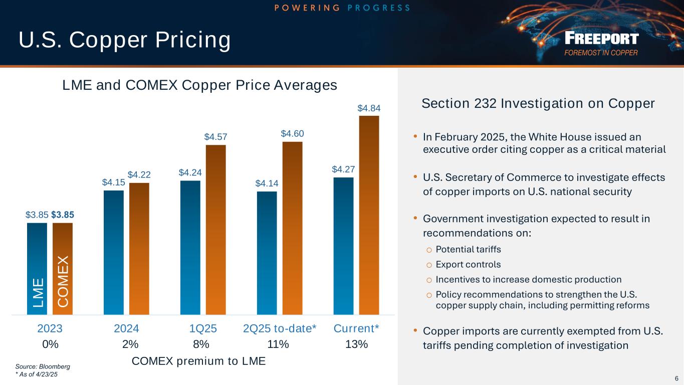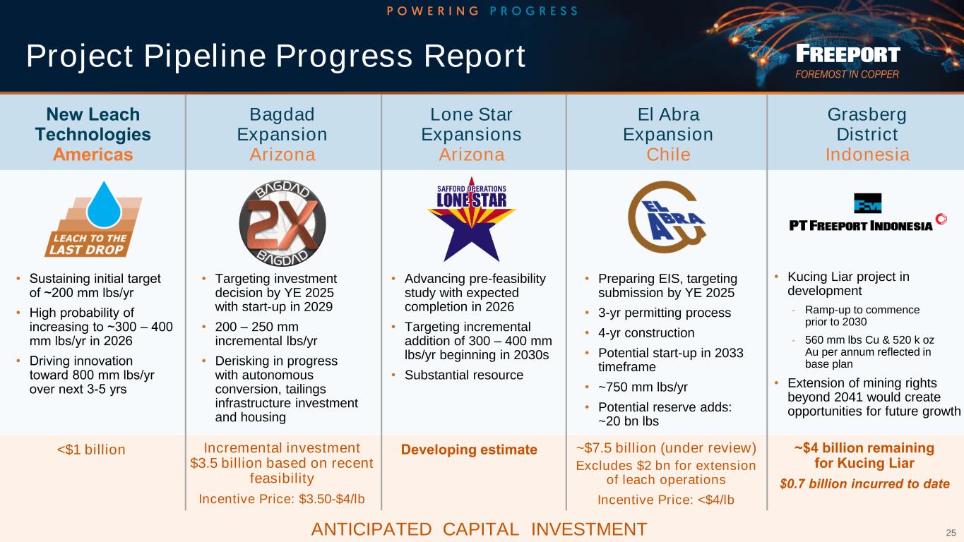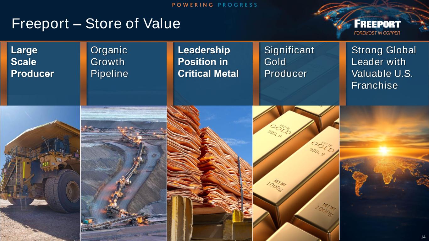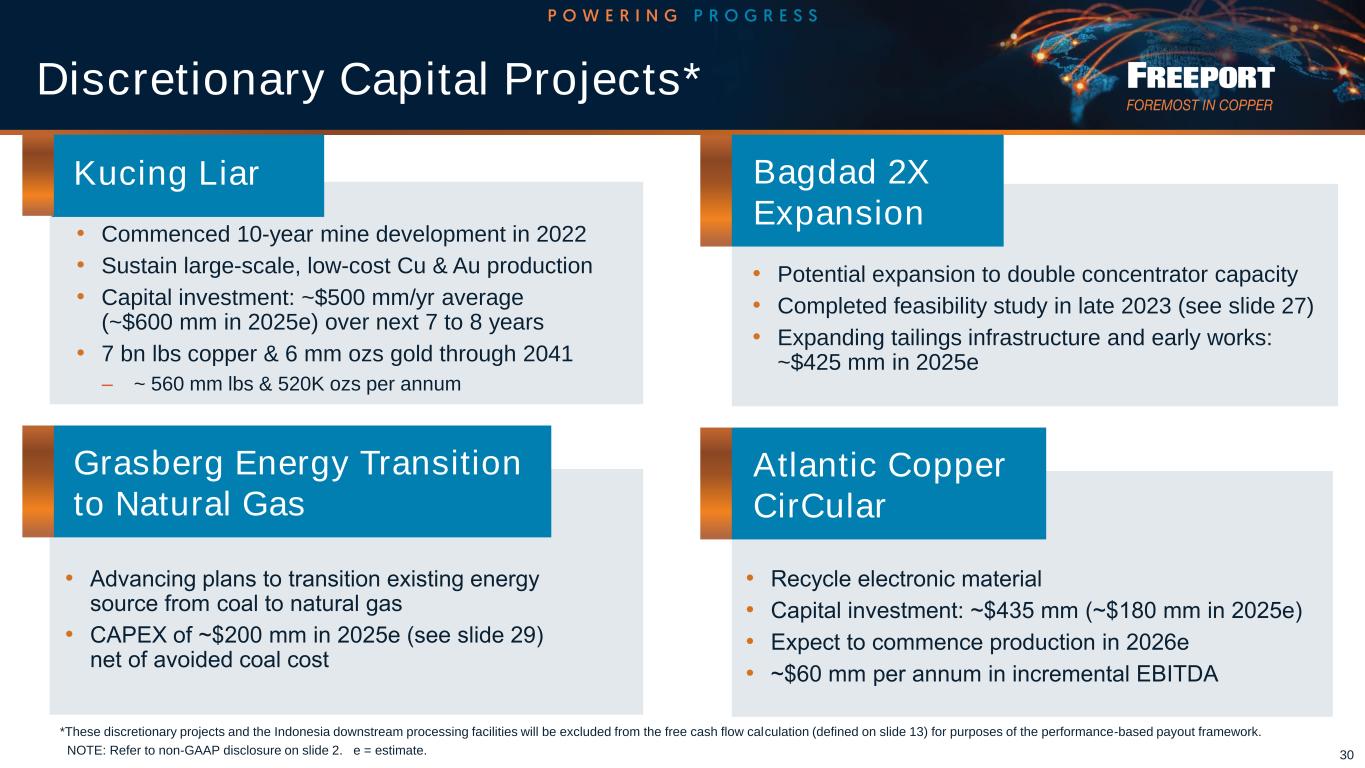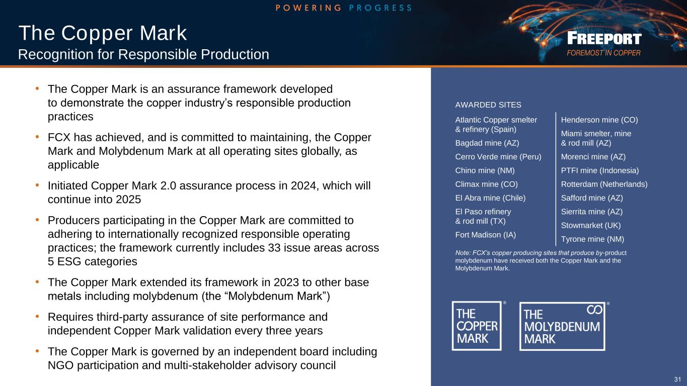 Cautionary Statement This presentation contains forward-looking statements in which FCX discusses its potential future performance, operations and projects. Forward-looking statements are all statements other than statements of historical facts, such as plans, projections or expectations relating to business outlook, strategy, goals or targets, and the underlying assumptions and estimated impacts on FCX’s business and stakeholders related thereto; global market conditions, including trade policies; ore grades and milling rates; production and sales volumes; unit net cash costs (credits) and operating costs; capital expenditures; operating plans, including mine sequencing; cash flows; liquidity; PT Freeport Indonesia’s (PTFI) remediation, commissioning and full ramp-up of its new smelter and full production and ramp-up at the precious metals refinery (PMR); potential extension of PTFI’s special mining business license (IUPK) beyond 2041; export licenses, export duties and export volumes, including PTFI’s ability to continue exports of copper concentrate until full ramp-up is achieved at its new smelter in Indonesia; timing of shipments of inventoried production; FCX’s sustainability-related commitments and targets; FCX’s overarching commitment to deliver responsibly produced copper and molybdenum, including plans to implement, validate and maintain validation of its operating sites under specific frameworks; achievement of FCX’s 2030 climate targets and its 2050 net zero aspiration; improvements in operating procedures and technology innovations and applications; exploration efforts and results; development and production activities, rates and costs; future organic growth opportunities; tax rates; the impact of copper, gold and molybdenum price changes; the impact of deferred intercompany profits on earnings; mineral reserve and mineral resource estimates; final resolution of settlements associated with ongoing legal and environmental proceedings; debt repurchases; and the ongoing implementation of FCX’s financial policy and future returns to shareholders, including dividend payments (base or variable) and share repurchases. The words “anticipates,” “may,” “can,” “plans,” “believes,” “estimates,” “expects,” “projects,” “targets,” “intends,” “likely,” “will,” “should,” “could,” “to be,” “potential,” “assumptions,” “guidance,” “aspirations,” “future,” “commitments,” “pursues,” “initiatives,” “objectives,” “opportunities,” “strategy” and any similar expressions are intended to identify those assertions as forward-looking statements. The declaration and payment of dividends (base or variable), and timing and amount of any share repurchases are at the discretion of the Board of Directors (Board) and management, respectively, and are subject to a number of factors, including not exceeding FCX’s net debt target, capital availability, FCX’s financial results, cash requirements, global economic conditions, changes in laws, contractual restrictions and other factors deemed relevant by the Board or management, as applicable. The share repurchase program may be modified, increased, suspended or terminated at any time at the Board’s discretion. FCX cautions readers that forward-looking statements are not guarantees of future performance and actual results may differ materially from those anticipated, expected, projected or assumed in the forward-looking statements. Important factors that can cause FCX’s actual results to differ materially from those anticipated in the forward-looking statements include, but are not limited to, supply of and demand for, and prices of the commodities FCX produces, primarily copper and gold; PTFI’s ability to export and sell or inventory copper concentrates through remediation and full ramp-up of its new smelter in Indonesia; changes in export duties and tariff rates; completion of remediation activities and achieving full ramp-up of the new smelter in Indonesia; full production and ramp-up at the PMR; production rates; timing of shipments; price and availability of consumables and components FCX purchases as well as constraints on supply and logistics, and transportation services; changes in cash requirements, financial position, financing or investment plans; changes in general market, economic, geopolitical, regulatory or industry conditions, including market volatility regarding trade policies and tariff uncertainty; reductions in liquidity and access to capital; changes in tax laws and regulations; political and social risks, including the potential effects of violence in Indonesia, civil unrest in Peru, and relations with local communities and Indigenous Peoples; operational risks inherent in mining, with higher inherent risks in underground mining; mine sequencing; changes in mine plans or operational modifications, delays, deferrals or cancellations, including the ability to smelt and refine or inventory; results of technical, economic or feasibility studies; potential inventory adjustments; potential impairment of long-lived mining assets; satisfaction of requirements in accordance with PTFI’s IUPK to extend mining rights from 2031 through 2041; process relating to the extension of PTFI’s IUPK beyond 2041; cybersecurity risks; any major public health crisis; labor relations, including labor-related work stoppages and increased costs; compliance with applicable environmental, health and safety laws and regulations; weather- and climate-related risks; environmental risks, including availability of secure water supplies; impacts, expenses or results from litigation or investigations; tailings management; FCX’s ability to comply with its responsible production commitments under specific frameworks and any changes to such frameworks and other factors described in more detail under the heading “Risk Factors” in FCX’s Annual Repo