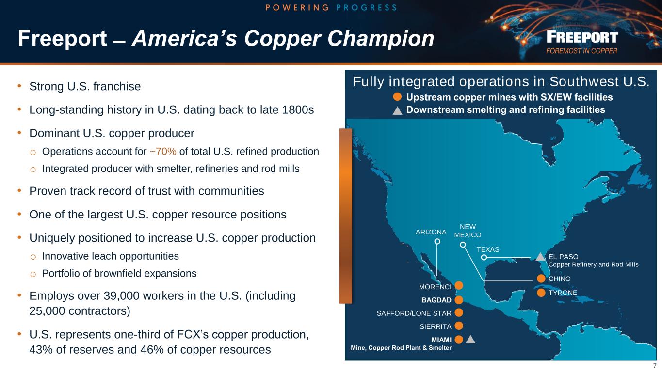 U.S. Copper Pricing 6 $3.85 $4.15 $4.24 $4.14 $4.27 $3.85 $4.22 $4.57 $4.60 $4.84 2023 2024 1Q25 2Q25 to-date* Current* L M E C O M E X LME and COMEX Copper Price Averages Source: Bloomberg * As of 4/23/25 COMEX premium to LME 0% 2% 8% 11% 13% Section 232 Investigation on Copper • In February 2025, the White House issued an executive order citing copper as a critical material • U.S. Secretary of Commerce to investigate effects of copper imports on U.S. national security • Government investigation expected to result in recommendations on: o Potential tariffs o Export controls o Incentives to increase domestic production o Policy recommendations to strengthen the U.S. copper supply chain, including permitting reforms • Copper imports are currently exempted from U.S. tariffs pending completion of investigation
