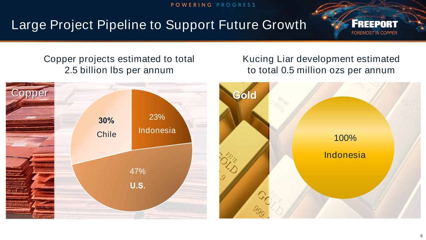 • Ongoing focus on operating efficiencies and costs • Volumes and costs expected to improve in 2025 vs. 2024 ‒ Working to mitigate potential tariff impact on imported goods • Scaling low-cost leaching initiative – Targeting run rate of 300 mm lbs per annum by YE 2025 • Technology opportunities in focus – Bagdad autonomous haulage in progress - expected to be commissioned in 2025 – New initiative under way targeting greater efficiencies and cost reduction • Copper price in U.S. currently reflects 13% premium to LME; equivalent to ~$800 mm per annum in estimated additional cash flow assuming COMEX price of $4.84/lb • Potential for “critical mineral” designation for copper through legislation and possible 10% tax credit United States Cu Sales: 307 mm lbs Unit Net Cash Costs: $3.11/lb 1Q 2025 Operation Update • Strong mill rates helped mitigate lower grades vs. 1Q24 • Unit net cash cost below 1Q24 • Planning heat application for El Abra leach stockpiles NOTE: Refer to non-GAAP disclosure on slide 2. e = estimate South America Cu Sales: 275 mm lbs Unit Net Cash Costs: $2.40/lb Indonesia Cu Sales: 290 mm lbs Au Sales: 125 k ozs Unit Net Cash Costs: $0.64/lb • Completed SAG3 maintenance in 1Q • Commencing SAG2 maintenance in 2Q • Quarterly volumes expected to improve in 2025 • 2025e sales: 1.6 bn lbs of copper and 1.6 mm ozs of gold • 2025e unit net cash credit: $0.47/lb • Smelter repairs nearing completion • Completion of smelter provides foundation to extend long- term operating rights • Ramp-up of precious metals refinery progressing 8