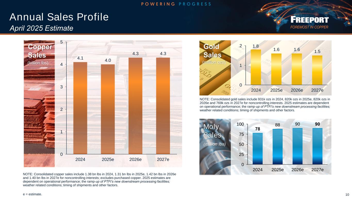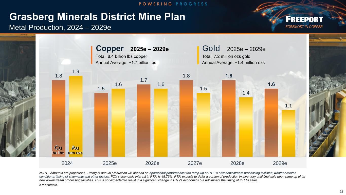 2025e Quarterly Sales 22e = estimate. (million lbs) Moly Sales (billion lbs) Copper Sales Gold Sales (million ozs) 0 150 300 450 600 1Q25 2Q25e 3Q25e 4Q25e 128 500 475 500 0 200 400 600 800 1000 1200 1Q25 2Q25e 3Q25e 4Q25e 872 1,005 1,095 1,025 0 5 10 15 20 25 1Q25 2Q25e 3Q25e 4Q25e 20 22 23 23 NOTE: Consolidated copper sales include 275 mm lbs in 1Q25, 345 mm lbs in 2Q25e, 366 mm lbs in 3Q25e and 323 mm lbs in 4Q25e for noncontrolling interests; excludes purchased copper. Estimates are dependent on operational performance; the ramp-up of PTFI’s new downstream processing facilities; weather related conditions; timing of shipments and other factors. NOTE: Consolidated gold sales include 64k ozs in 1Q25, 256k ozs in 2Q25e, 244k ozs in 3Q25e and 256k ozs in 4Q25e for noncontrolling interests. Estimates are dependent on operational performance; the ramp-up of PTFI’s new downstream processing facilities; weather related conditions; timing of shipments and other factors.