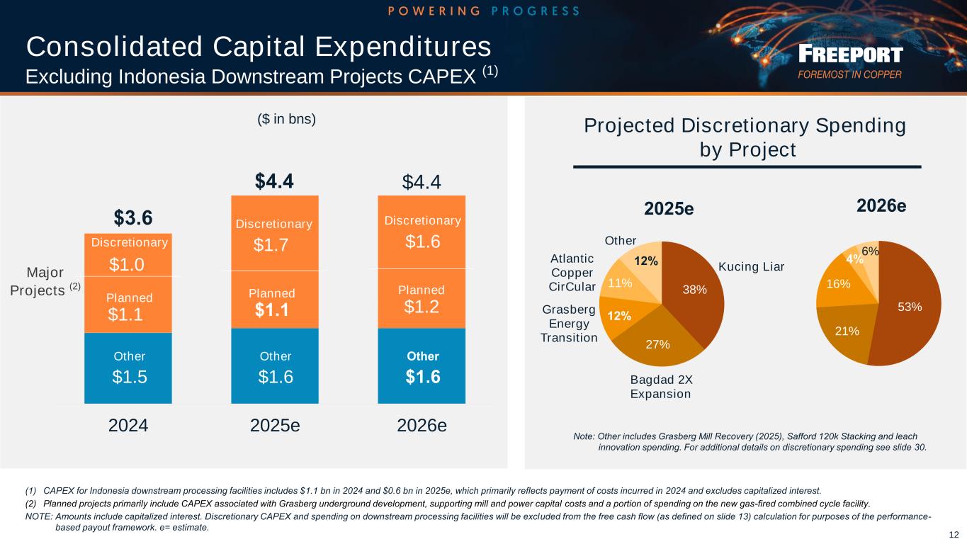 EBITDA and Cash Flow at Various Copper Prices Assuming $3,000/oz gold, $20/lb molybdenum 11 NOTE: Refer to non-GAAP disclosure on slide 2. e = estimate. (1) U.S. Dollar Exchange Rates: 938 Chilean peso, 16,000 Indonesian rupiah, $0.63 Australian dollar, $1.09 euro, 3.62 Peruvian sol base case assumption. Each +10% equals a 10% strengthening of the U.S. dollar; a strengthening of the U.S. dollar against forecasted expenditures in these foreign currencies equates to a cost benefit of noted amounts. $0 $4 $8 $12 $16 Cu $4.00/lb Cu $4.50/lb Cu $5.00/lb Average ’26e/’27e $0 $3 $6 $9 $12 Cu $4.00/lb Cu $4.50/lb Cu $5.00/lb Average ’26e/’27e ($ in bns except copper, gold and molybdenum prices) Operating Cash Flow Excludes working capital changes EBITDA Sensitivities Average ’26e/’27e (US$ in mms) EBITDA Operating Cash Flow Copper +/-$0.10/lb $330 COMEX Premium to LME +/-$0.10/lb $135 Molybdenum +/-$1.00/lb $ 80 Gold +/-$100/oz $100 Currencies (1) +/-10% $165 Diesel +/-10% $ 50 Copper +/-$0.10/lb $425 COMEX Premium to LME +/-$0.10/lb $135 Molybdenum +/-$1.00/lb $ 85 Gold +/-$100/oz $150 Currencies (1) +/-10% $235 Diesel +/-10% $ 75