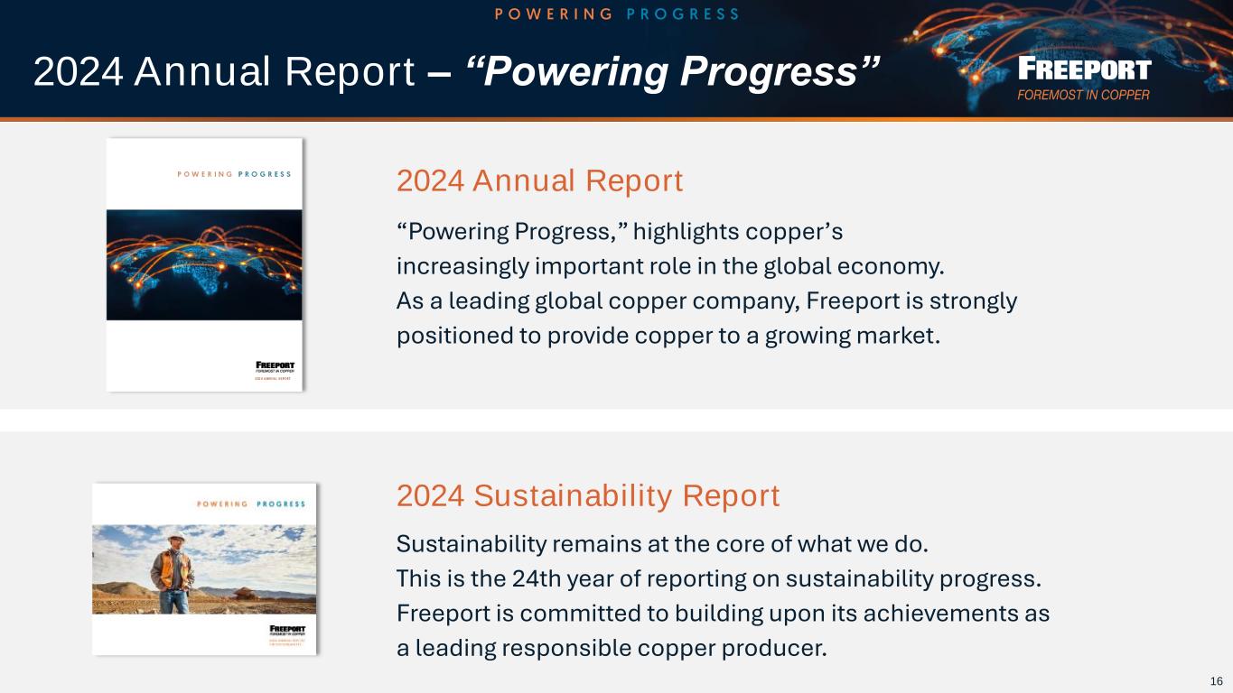 2024 Annual Report – “Powering Progress” 2024 Annual Report 2024 Sustainability Report “Powering Progress,” highlights copper’s increasingly important role in the global economy. As a leading global copper company, Freeport is strongly positioned to provide copper to a growing market. Sustainability remains at the core of what we do. This is the 24th year of reporting on sustainability progress. Freeport is committed to building upon its achievements as a leading responsible copper producer. 16
