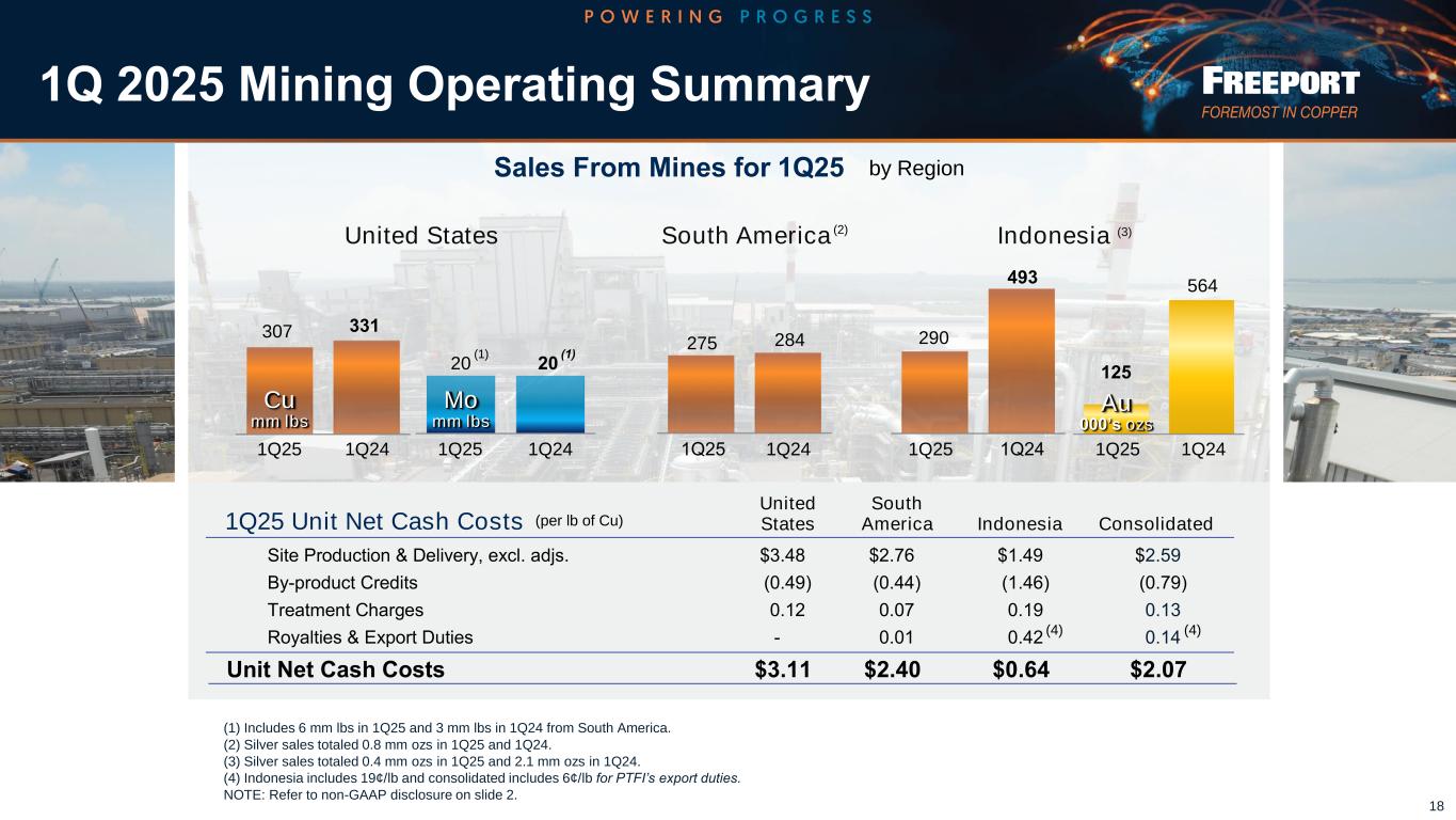 Financial Highlights 17 Copper Consolidated Volumes, excluding purchases (mm lbs) 872 1,108 Average Realization (per lb) $ 4.44 $ 3.94 Site Production & Delivery Costs (per lb) $ 2.59 $ 2.32 Unit Net Cash Costs (per lb) $ 2.07 $ 1.51 Gold Consolidated Volumes (000’s ozs) 128 568 Average Realization (per oz) $3,072 $2,145 Molybdenum Consolidated Volumes (mm lbs) 20 20 Average Realization (per lb) $21.67 $20.38 1Q25 (1) Includes working capital and other uses of $0.3 bn in 1Q25 and $0.1 bn in 1Q24. (2) Includes $3.0 bn in senior notes issued by PTFI, and as of 3/31/25, $0.25 bn in borrowings under the PTFI revolver. (3) Excludes current restricted cash of $0.3 bn at 3/31/25 (expected to be released by mid-2025) and $0.9 bn at 3/31/24 associated with a portion of PTFI's export proceeds that was required to be temporarily deposited in Indonesia banks for 90 days in accordance with a previous Indonesia regulation. NOTE: Refer to non-GAAP disclosure on slide 2. Revenues $ 5.7 $ 6.3 Net Income Attributable to Common Stock $ 0.4 $ 0.5 Diluted Net Income Per Share $ 0.24 $ 0.32 Operating Cash Flows $ 1.1 $ 1.9 Capital Expenditures $ 1.2 $ 1.3 Total Debt $ 9.4 $ 9.4 Consolidated Cash and Cash Equivalents $ 4.4 $ 5.2 (1) (in billions, except per share amounts) | Sales Data | Financial Results 1Q24 (2) (3)