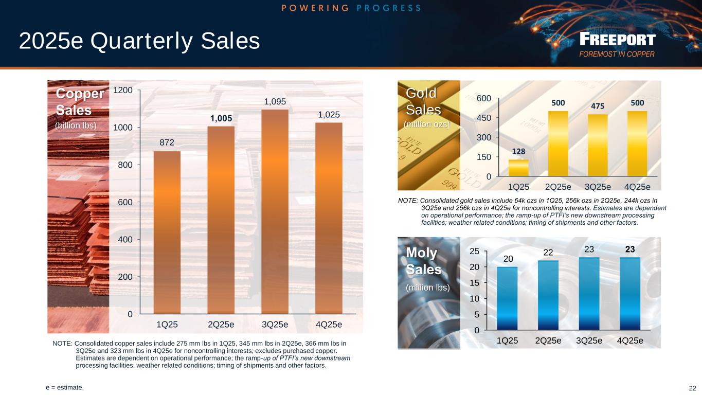 2025e Operational Data 21 by Region2025e Sales (1) 1,090 88 1,327 1,580 1.6 (3) United States Indonesia(2)South America (per lb of Cu)Site Production & Delivery (5) $3.41 $2.79 $1.82 $2.61 By-product Credits (0.52) (0.35) (3.08) (1.49) Treatment Charges 0.13 0.07 0.31 0.19 Royalties & Export Duties 0.00 0.01 0.48 0.19 Unit Net Cash Costs / (Credits) $3.02 $2.52 $(0.47) $1.50 2025e Unit Net Cash Costs / (Credits) (4) United South States America Indonesia Consolidated NOTE: Refer to non-GAAP disclosure on slide 2. e = estimate. (7) (7) Au mm ozs Mo mm lbs Cu mm lbs Cu mm lbs Cu mm lbs (1) Includes molybdenum produced in South America. (2) Copper and gold sales estimates are dependent on operational performance; the ramp-up of PTFI’s new downstream processing facilities; weather related conditions; timing of shipments and other factors. (3) Includes gold produced in U.S. (4) Estimates assume average prices of $3,000 oz gold and $20/lb molybdenum for 2Q25e - 4Q25e. Quarterly unit costs will vary significantly with quarterly metal sales volumes. (5) Production costs include profit sharing in South America and severance taxes in U.S. (6) Excludes potential impacts from proposed tariffs announced to date. Efforts underway to mitigate potential impacts. (7) Indonesia includes 21¢/lb and consolidated includes 8¢/lb for export duties at PTFI. (6)