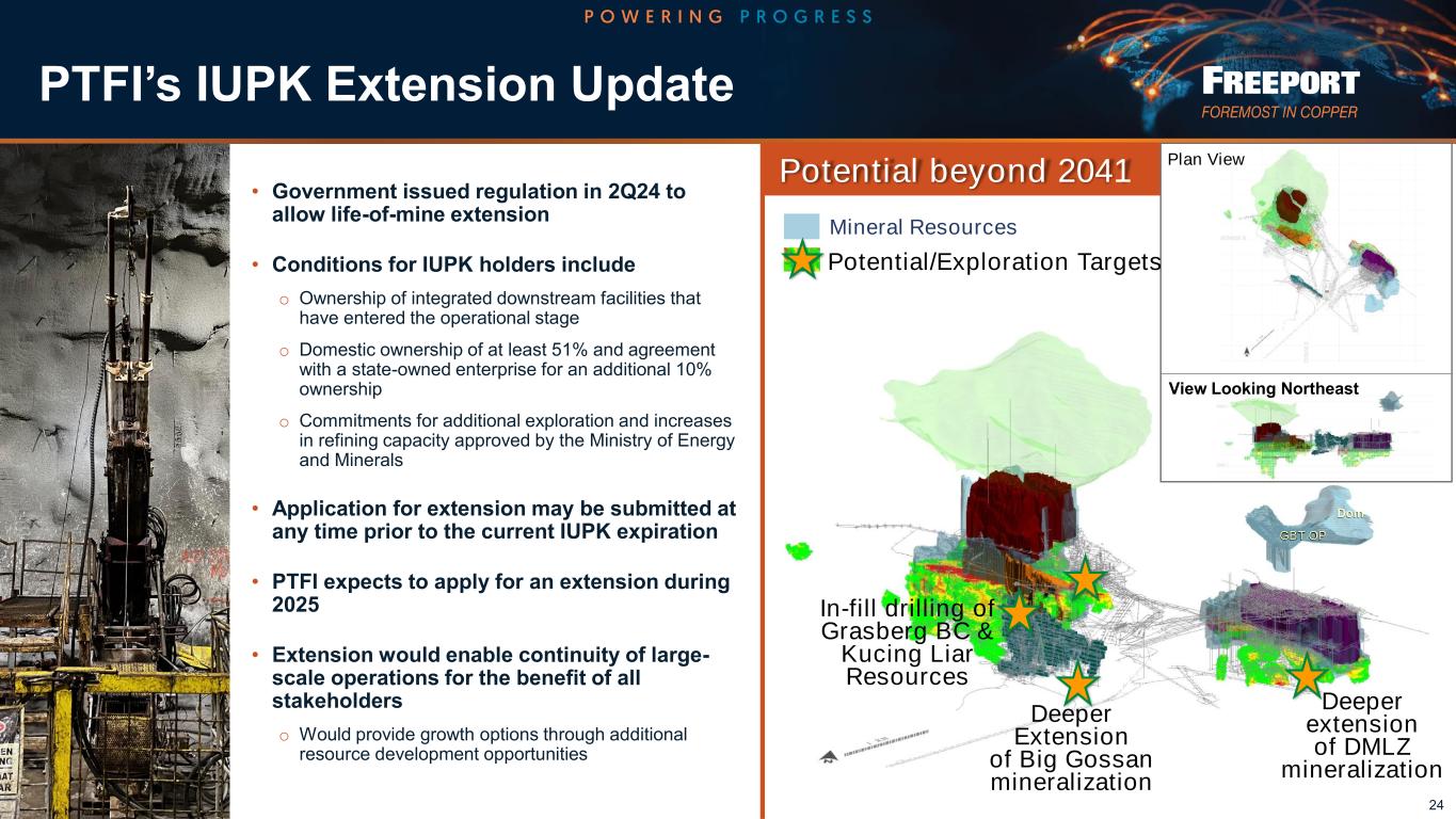 PTFI’s IUPK Extension Update Potential beyond 2041 Plan View View Looking Northeast Dom GBT OP Mineral Resources Deeper Extension of Big Gossan mineralization In-fill drilling of Grasberg BC & Kucing Liar Resources Deeper extension of DMLZ mineralization Potential/Exploration Targets • Government issued regulation in 2Q24 to allow life-of-mine extension • Conditions for IUPK holders include o Ownership of integrated downstream facilities that have entered the operational stage o Domestic ownership of at least 51% and agreement with a state-owned enterprise for an additional 10% ownership o Commitments for additional exploration and increases in refining capacity approved by the Ministry of Energy and Minerals • Application for extension may be submitted at any time prior to the current IUPK expiration • PTFI expects to apply for an extension during 2025 • Extension would enable continuity of large- scale operations for the benefit of all stakeholders o Would provide growth options through additional resource development opportunities 24