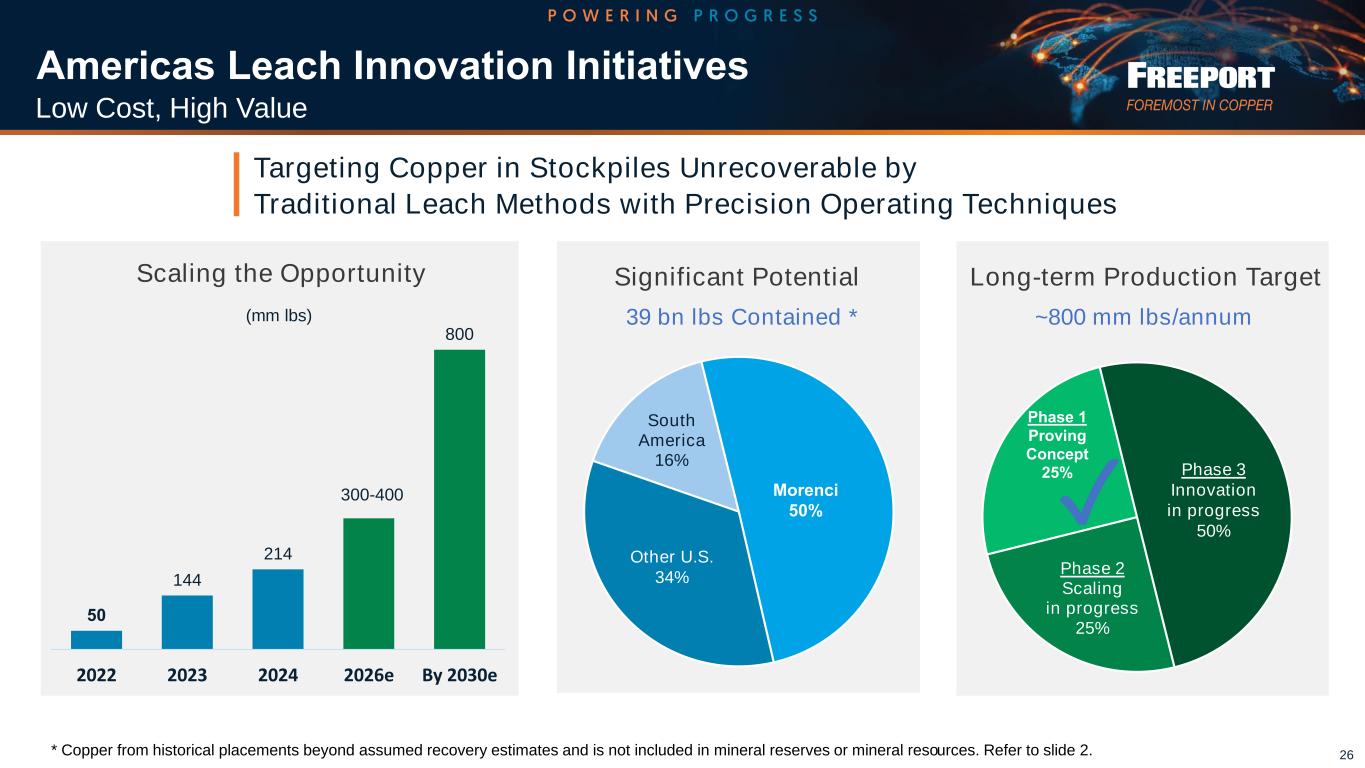 Project Pipeline Progress Report 25 El Abra Expansion Chile Lone Star Expansions Arizona Grasberg District Indonesia Bagdad Expansion Arizona New Leach Technologies Americas • Sustaining initial target of ~200 mm lbs/yr • High probability of increasing to ~300 – 400 mm lbs/yr in 2026 • Driving innovation toward 800 mm lbs/yr over next 3-5 yrs • Targeting investment decision by YE 2025 with start-up in 2029 • 200 – 250 mm incremental lbs/yr • Derisking in progress with autonomous conversion, tailings infrastructure investment and housing • Advancing pre-feasibility study with expected completion in 2026 • Targeting incremental addition of 300 – 400 mm lbs/yr beginning in 2030s • Substantial resource • Kucing Liar project in development - Ramp-up to commence prior to 2030 - 560 mm lbs Cu & 520 k oz Au per annum reflected in base plan • Extension of mining rights beyond 2041 would create opportunities for future growth • Preparing EIS, targeting submission by YE 2025 • 3-yr permitting process • 4-yr construction • Potential start-up in 2033 timeframe • ~750 mm lbs/yr • Potential reserve adds: ~20 bn lbs <$1 billion Incremental investment $3.5 billion based on recent feasibility Incentive Price: $3.50-$4/lb Developing estimate ~$4 billion remaining for Kucing Liar $0.7 billion incurred to date ~$7.5 billion (under review) Excludes $2 bn for extension of leach operations Incentive Price: <$4/lb ANTICIPATED CAPITAL INVESTMENT