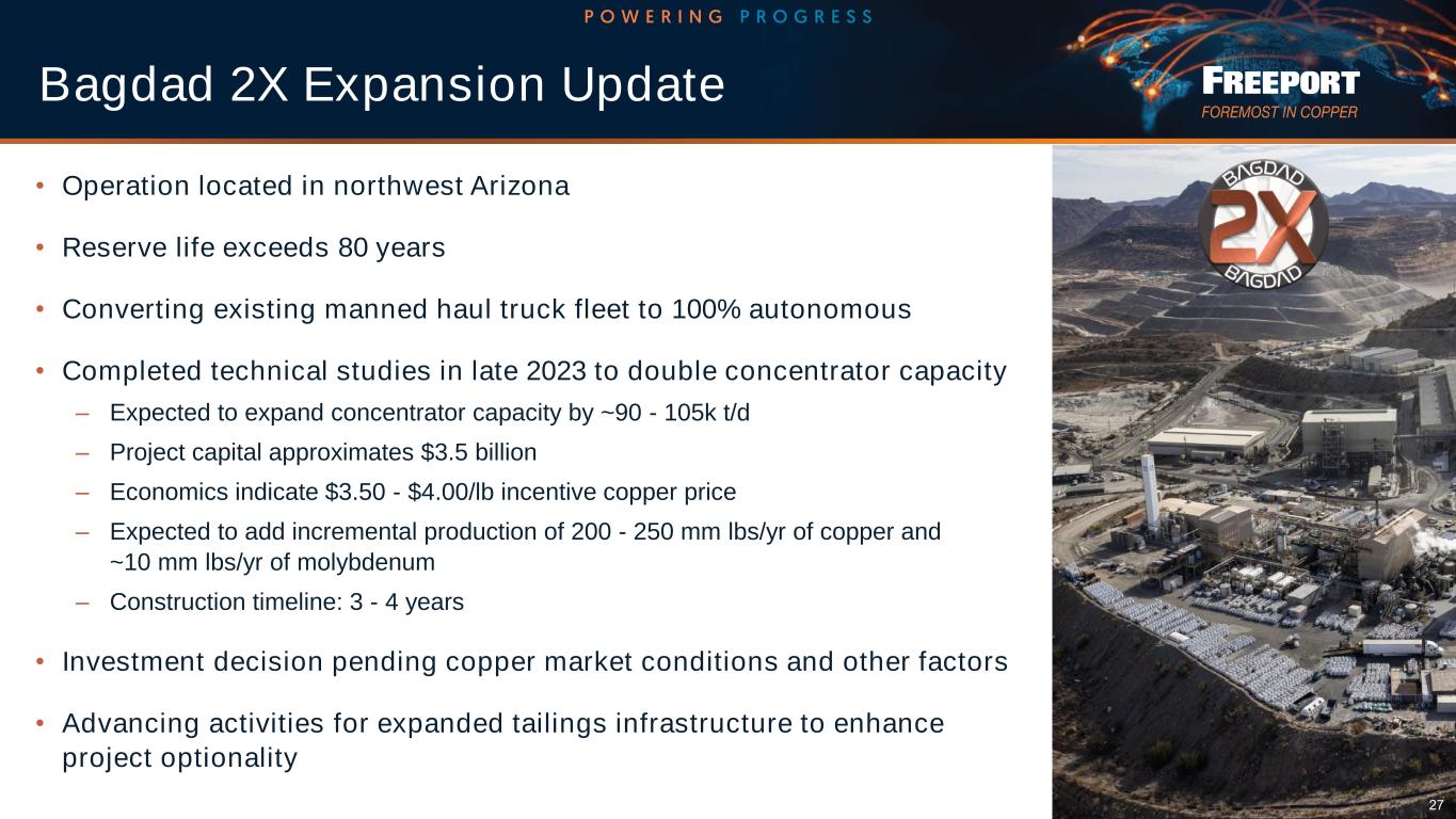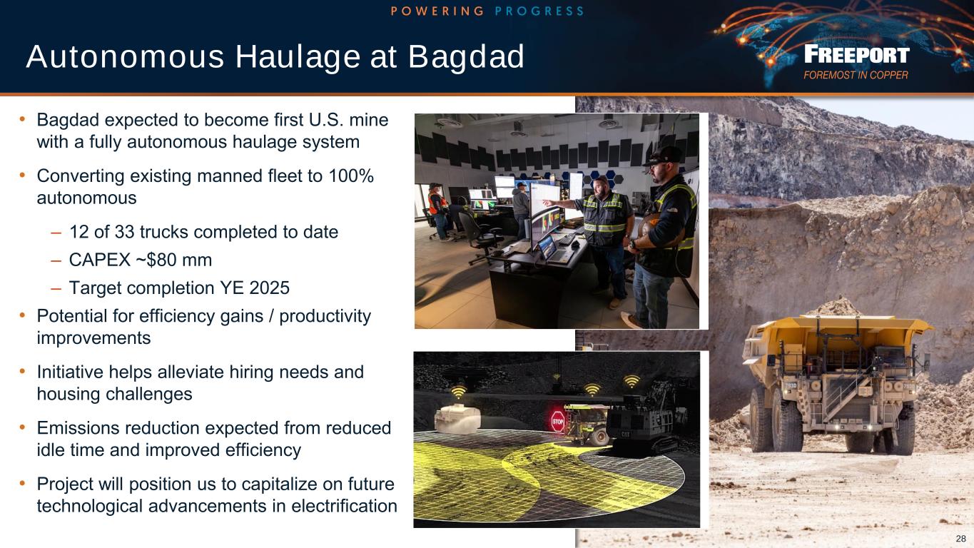 Bagdad 2X Expansion Update 27 • Operation located in northwest Arizona • Reserve life exceeds 80 years • Converting existing manned haul truck fleet to 100% autonomous • Completed technical studies in late 2023 to double concentrator capacity – Expected to expand concentrator capacity by ~90 - 105k t/d – Project capital approximates $3.5 billion – Economics indicate $3.50 - $4.00/lb incentive copper price – Expected to add incremental production of 200 - 250 mm lbs/yr of copper and ~10 mm lbs/yr of molybdenum – Construction timeline: 3 - 4 years • Investment decision pending copper market conditions and other factors • Advancing activities for expanded tailings infrastructure to enhance project optionality