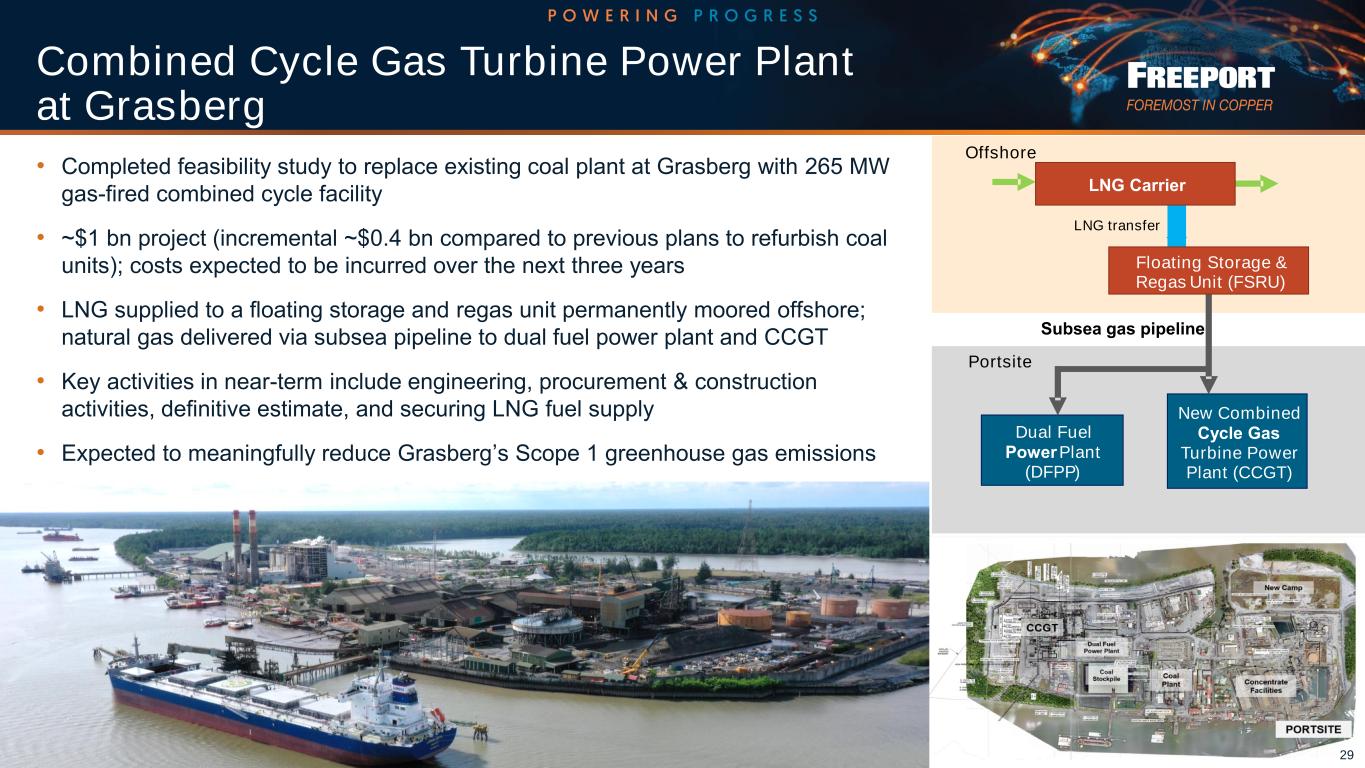 Combined Cycle Gas Turbine Power Plant at Grasberg 29 New Combined Cycle Gas Turbine Power Plant (CCGT) Dual Fuel Power Plant (DFPP) Subsea gas pipeline Portsite LNG transfer Offshore LNG Carrier Floating Storage & Regas Unit (FSRU) • Completed feasibility study to replace existing coal plant at Grasberg with 265 MW gas-fired combined cycle facility • ~$1 bn project (incremental ~$0.4 bn compared to previous plans to refurbish coal units); costs expected to be incurred over the next three years • LNG supplied to a floating storage and regas unit permanently moored offshore; natural gas delivered via subsea pipeline to dual fuel power plant and CCGT • Key activities in near-term include engineering, procurement & construction activities, definitive estimate, and securing LNG fuel supply • Expected to meaningfully reduce Grasberg’s Scope 1 greenhouse gas emissions