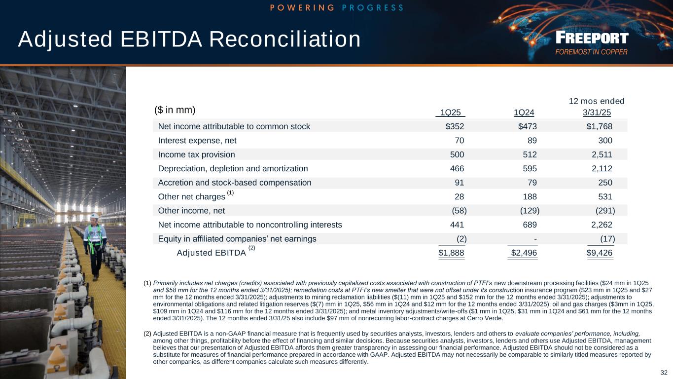 Adjusted EBITDA Reconciliation 32 ($ in mm) 12 mos ended 1Q25 1Q24 3/31/25 Net income attributable to common stock $352 $473 $1,768 Interest expense, net 70 89 300 Income tax provision 500 512 2,511 Depreciation, depletion and amortization 466 595 2,112 Accretion and stock-based compensation 91 79 250 Other net charges (1) 28 188 531 Other income, net (58) (129) (291) Net income attributable to noncontrolling interests 441 689 2,262 Equity in affiliated companies’ net earnings (2) - (17) Adjusted EBITDA (2) $1,888 $2,496 $9,426 (1) Primarily includes net charges (credits) associated with previously capitalized costs associated with construction of PTFI’s new downstream processing facilities ($24 mm in 1Q25 and $58 mm for the 12 months ended 3/31/2025); remediation costs at PTFI’s new smelter that were not offset under its construction insurance program ($23 mm in 1Q25 and $27 mm for the 12 months ended 3/31/2025); adjustments to mining reclamation liabilities ($(11) mm in 1Q25 and $152 mm for the 12 months ended 3/31/2025); adjustments to environmental obligations and related litigation reserves ($(7) mm in 1Q25, $56 mm in 1Q24 and $12 mm for the 12 months ended 3/31/2025); oil and gas charges ($3mm in 1Q25, $109 mm in 1Q24 and $116 mm for the 12 months ended 3/31/2025); and metal inventory adjustments/write-offs ($1 mm in 1Q25, $31 mm in 1Q24 and $61 mm for the 12 months ended 3/31/2025). The 12 months ended 3/31/25 also include $97 mm of nonrecurring labor-contract charges at Cerro Verde. (2) Adjusted EBITDA is a non-GAAP financial measure that is frequently used by securities analysts, investors, lenders and others to evaluate companies’ performance, including, among other things, profitability before the effect of financing and similar decisions. Because securities analysts, investors, lenders and others use Adjusted EBITDA, management believes that our presentation of Adjusted EBITDA affords them greater transparency in assessing our financial performance. Adjusted EBITDA should not be considered as a substitute for measures of financial performance prepared in accordance with GAAP. Adjusted EBITDA may not necessarily be comparable to similarly titled measures reported by other companies, as different companies calculate such measures differently.