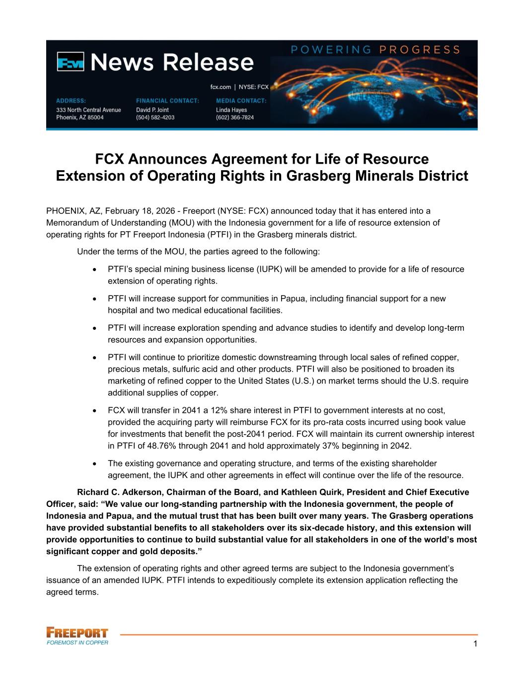 1 FCX Announces Agreement for Life of Resource Extension of Operating Rights in Grasberg Minerals District PHOENIX, AZ, February 18, 2026 - Freeport (NYSE: FCX) announced today that it has entered into a Memorandum of Understanding (MOU) with the Indonesia government for a life of resource extension of operating rights for PT Freeport Indonesia (PTFI) in the Grasberg minerals district. Under the terms of the MOU, the parties agreed to the following: • PTFI’s special mining business license (IUPK) will be amended to provide for a life of resource extension of operating rights. • PTFI will increase support for communities in Papua, including financial support for a new hospital and two medical educational facilities. • PTFI will increase exploration spending and advance studies to identify and develop long-term resources and expansion opportunities. • PTFI will continue to prioritize domestic downstreaming through local sales of refined copper, precious metals, sulfuric acid and other products. PTFI will also be positioned to broaden its marketing of refined copper to the United States (U.S.) on market terms should the U.S. require additional supplies of copper. • FCX will transfer in 2041 a 12% share interest in PTFI to government interests at no cost, provided the acquiring party will reimburse FCX for its pro-rata costs incurred using book value for investments that benefit the post-2041 period. FCX will maintain its current ownership interest in PTFI of 48.76% through 2041 and hold approximately 37% beginning in 2042. • The existing governance and operating structure, and terms of the existing shareholder agreement, the IUPK and other agreements in effect will continue over the life of the resource. Richard C. Adkerson, Chairman of the Board, and Kathleen Quirk, President and Chief Executive Officer, said: “We value our long-standing partnership with the Indonesia government, the people of Indonesia and Papua, and the mutual trust that has been built over many years. The Grasberg operations have provided substantial benefits to all stakeholders over its six-decade history, and this extension will provide opportunities to continue to build substantial value for all stakeholders in one of the world’s most significant copper and gold deposits.” The extension of operating rights and other agreed terms are subject to the Indonesia government’s issuance of an amended IUPK. PTFI intends to expeditiously complete its extension application reflecting the agreed terms.