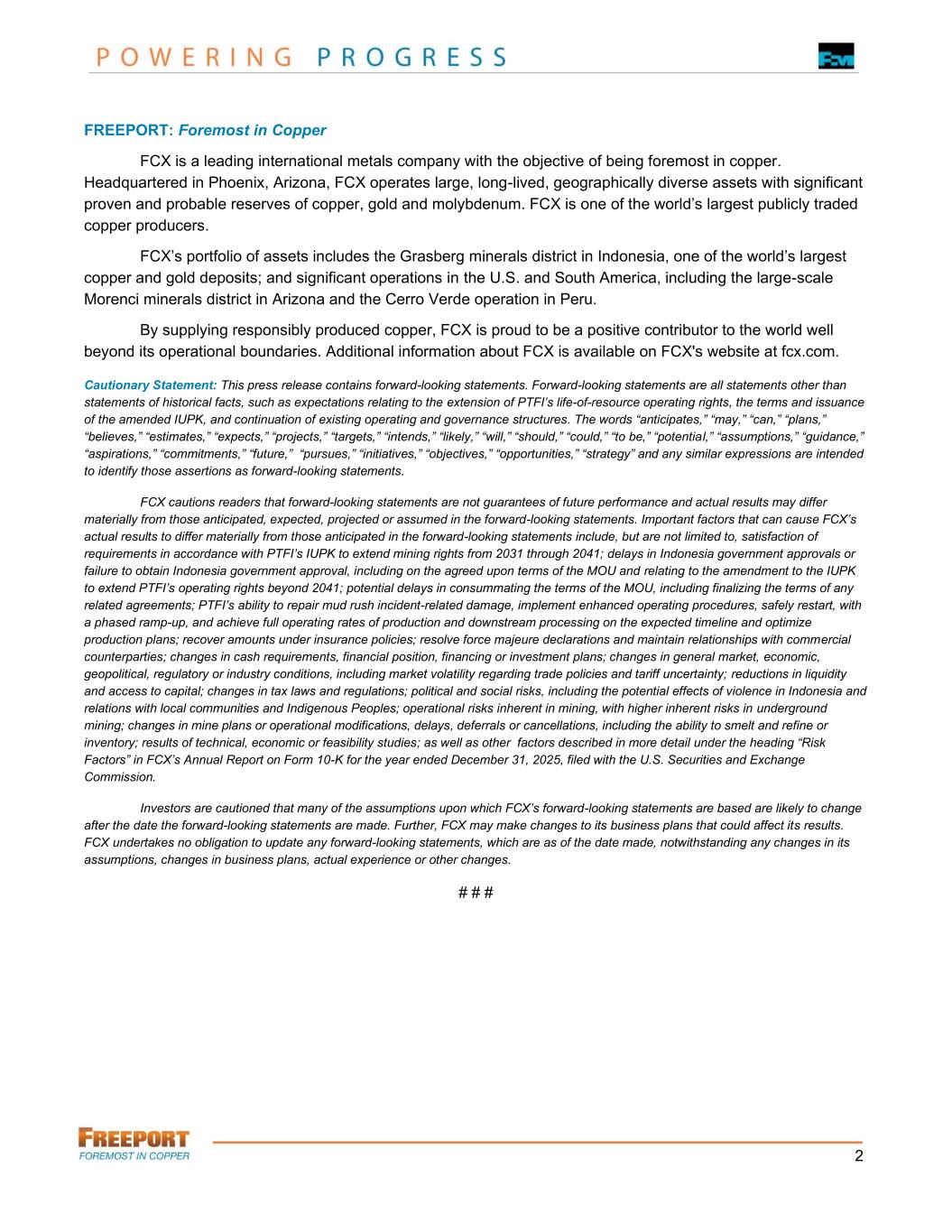 {N4163160.1} 2 FREEPORT: Foremost in Copper FCX is a leading international metals company with the objective of being foremost in copper. Headquartered in Phoenix, Arizona, FCX operates large, long-lived, geographically diverse assets with significant proven and probable reserves of copper, gold and molybdenum. FCX is one of the world’s largest publicly traded copper producers. FCX’s portfolio of assets includes the Grasberg minerals district in Indonesia, one of the world’s largest copper and gold deposits; and significant operations in the U.S. and South America, including the large-scale Morenci minerals district in Arizona and the Cerro Verde operation in Peru. By supplying responsibly produced copper, FCX is proud to be a positive contributor to the world well beyond its operational boundaries. Additional information about FCX is available on FCX's website at fcx.com. Cautionary Statement: This press release contains forward-looking statements. Forward-looking statements are all statements other than statements of historical facts, such as expectations relating to the extension of PTFI’s life-of-resource operating rights, the terms and issuance of the amended IUPK, and continuation of existing operating and governance structures. The words “anticipates,” “may,” “can,” “plans,” “believes,” “estimates,” “expects,” “projects,” “targets,” “intends,” “likely,” “will,” “should,” “could,” “to be,” “potential,” “assumptions,” “guidance,” “aspirations,” “commitments,” “future,” “pursues,” “initiatives,” “objectives,” “opportunities,” “strategy” and any similar expressions are intended to identify those assertions as forward-looking statements. FCX cautions readers that forward-looking statements are not guarantees of future performance and actual results may differ materially from those anticipated, expected, projected or assumed in the forward-looking statements. Important factors that can cause FCX’s actual results to differ materially from those anticipated in the forward-looking statements include, but are not limited to, satisfaction of requirements in accordance with PTFI’s IUPK to extend mining rights from 2031 through 2041; delays in Indonesia government approvals or failure to obtain Indonesia government approval, including on the agreed upon terms of the MOU and relating to the amendment to the IUPK to extend PTFI’s operating rights beyond 2041; potential delays in consummating the terms of the MOU, including finalizing the terms of any related agreements; PTFI’s ability to repair mud rush incident-related damage, implement enhanced operating procedures, safely restart, with a phased ramp-up, and achieve full operating rates of production and downstream processing on the expected timeline and optimize production plans; recover amounts under insurance policies; resolve force majeure declarations and maintain relationships with commercial counterparties; changes in cash requirements, financial position, financing or investment plans; changes in general market, economic, geopolitical, regulatory or industry conditions, including market volatility regarding trade policies and tariff uncertainty; reductions in liquidity and access to capital; changes in tax laws and regulations; political and social risks, including the potential effects of violence in Indonesia and relations with local communities and Indigenous Peoples; operational risks inherent in mining, with higher inherent risks in underground mining; changes in mine plans or operational modifications, delays, deferrals or cancellations, including the ability to smelt and refine or inventory; results of technical, economic or feasibility studies; as well as other factors described in more detail under the heading “Risk Factors” in FCX’s Annual Report on Form 10-K for the year ended December 31, 2025, filed with the U.S. Securities and Exchange Commission. Investors are cautioned that many of the assumptions upon which FCX’s forward-looking statements are based are likely to change after the date the forward-looking statements are made. Further, FCX may make changes to its business plans that could affect its results. FCX undertakes no obligation to update any forward-looking statements, which are as of the date made, notwithstanding any changes in its assumptions, changes in business plans, actual experience or other changes. # # #