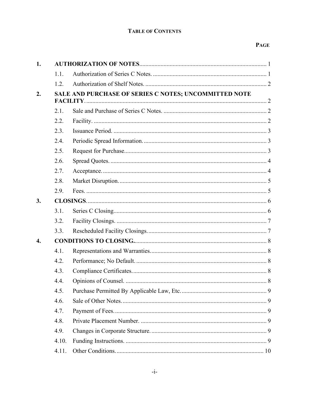 TABLE OF CONTENTS PAGE -i- 1. AUTHORIZATION OF NOTES.................................................................................... 1 1.1. Authorization of Series C Notes. ........................................................................... 1 1.2. Authorization of Shelf Notes. ................................................................................ 2 2. SALE AND PURCHASE OF SERIES C NOTES; UNCOMMITTED NOTE FACILITY. ....................................................................................................................... 2 2.1. Sale and Purchase of Series C Notes. .................................................................... 2 2.2. Facility. .................................................................................................................. 2 2.3. Issuance Period. ..................................................................................................... 3 2.4. Periodic Spread Information. ................................................................................. 3 2.5. Request for Purchase.............................................................................................. 3 2.6. Spread Quotes. ....................................................................................................... 4 2.7. Acceptance. ............................................................................................................ 4 2.8. Market Disruption. ................................................................................................. 5 2.9. Fees. ....................................................................................................................... 5 3. CLOSINGS. ...................................................................................................................... 6 3.1. Series C Closing. .................................................................................................... 6 3.2. Facility Closings. ................................................................................................... 7 3.3. Rescheduled Facility Closings. .............................................................................. 7 4. CONDITIONS TO CLOSING........................................................................................ 8 4.1. Representations and Warranties. ............................................................................ 8 4.2. Performance; No Default. ...................................................................................... 8 4.3. Compliance Certificates. ........................................................................................ 8 4.4. Opinions of Counsel. ............................................................................................. 8 4.5. Purchase Permitted By Applicable Law, Etc. ........................................................ 9 4.6. Sale of Other Notes. ............................................................................................... 9 4.7. Payment of Fees. .................................................................................................... 9 4.8. Private Placement Number. ................................................................................... 9 4.9. Changes in Corporate Structure. ............................................................................ 9 4.10. Funding Instructions. ............................................................................................. 9 4.11. Other Conditions. ................................................................................................. 10