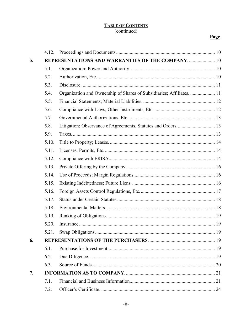 TABLE OF CONTENTS (continued) Page -ii- 4.12. Proceedings and Documents. ............................................................................... 10 5. REPRESENTATIONS AND WARRANTIES OF THE COMPANY. ..................... 10 5.1. Organization; Power and Authority. .................................................................... 10 5.2. Authorization, Etc. ............................................................................................... 10 5.3. Disclosure. ........................................................................................................... 11 5.4. Organization and Ownership of Shares of Subsidiaries; Affiliates. .................... 11 5.5. Financial Statements; Material Liabilities. .......................................................... 12 5.6. Compliance with Laws, Other Instruments, Etc. ................................................. 12 5.7. Governmental Authorizations, Etc....................................................................... 13 5.8. Litigation; Observance of Agreements, Statutes and Orders. .............................. 13 5.9. Taxes. ................................................................................................................... 13 5.10. Title to Property; Leases. ..................................................................................... 14 5.11. Licenses, Permits, Etc. ......................................................................................... 14 5.12. Compliance with ERISA...................................................................................... 14 5.13. Private Offering by the Company. ....................................................................... 16 5.14. Use of Proceeds; Margin Regulations.................................................................. 16 5.15. Existing Indebtedness; Future Liens. ................................................................... 16 5.16. Foreign Assets Control Regulations, Etc. ............................................................ 17 5.17. Status under Certain Statutes. .............................................................................. 18 5.18. Environmental Matters......................................................................................... 18 5.19. Ranking of Obligations. ....................................................................................... 19 5.20. Insurance .............................................................................................................. 19 5.21. Swap Obligations ................................................................................................. 19 6. REPRESENTATIONS OF THE PURCHASERS. ..................................................... 19 6.1. Purchase for Investment. ...................................................................................... 19 6.2. Due Diligence. ..................................................................................................... 19 6.3. Source of Funds. .................................................................................................. 20 7. INFORMATION AS TO COMPANY. ........................................................................ 21 7.1. Financial and Business Information. .................................................................... 21 7.2. Officer’s Certificate. ............................................................................................ 24