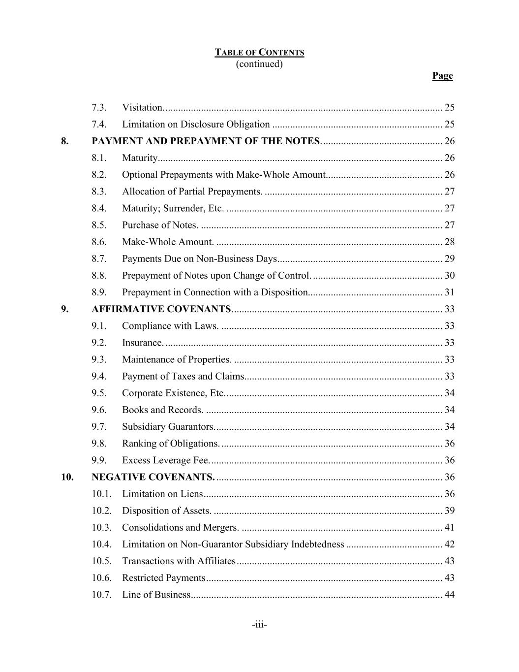 TABLE OF CONTENTS (continued) Page -iii- 7.3. Visitation. ............................................................................................................. 25 7.4. Limitation on Disclosure Obligation ................................................................... 25 8. PAYMENT AND PREPAYMENT OF THE NOTES. ............................................... 26 8.1. Maturity................................................................................................................ 26 8.2. Optional Prepayments with Make-Whole Amount.............................................. 26 8.3. Allocation of Partial Prepayments. ...................................................................... 27 8.4. Maturity; Surrender, Etc. ..................................................................................... 27 8.5. Purchase of Notes. ............................................................................................... 27 8.6. Make-Whole Amount. ......................................................................................... 28 8.7. Payments Due on Non-Business Days ................................................................. 29 8.8. Prepayment of Notes upon Change of Control. ................................................... 30 8.9. Prepayment in Connection with a Disposition..................................................... 31 9. AFFIRMATIVE COVENANTS. .................................................................................. 33 9.1. Compliance with Laws. ....................................................................................... 33 9.2. Insurance. ............................................................................................................. 33 9.3. Maintenance of Properties. .................................................................................. 33 9.4. Payment of Taxes and Claims.............................................................................. 33 9.5. Corporate Existence, Etc. ..................................................................................... 34 9.6. Books and Records. ............................................................................................. 34 9.7. Subsidiary Guarantors. ......................................................................................... 34 9.8. Ranking of Obligations. ....................................................................................... 36 9.9. Excess Leverage Fee. ........................................................................................... 36 10. NEGATIVE COVENANTS. ......................................................................................... 36 10.1. Limitation on Liens .............................................................................................. 36 10.2. Disposition of Assets. .......................................................................................... 39 10.3. Consolidations and Mergers. ............................................................................... 41 10.4. Limitation on Non-Guarantor Subsidiary Indebtedness ...................................... 42 10.5. Transactions with Affiliates ................................................................................. 43 10.6. Restricted Payments ............................................................................................. 43 10.7. Line of Business ................................................................................................... 44