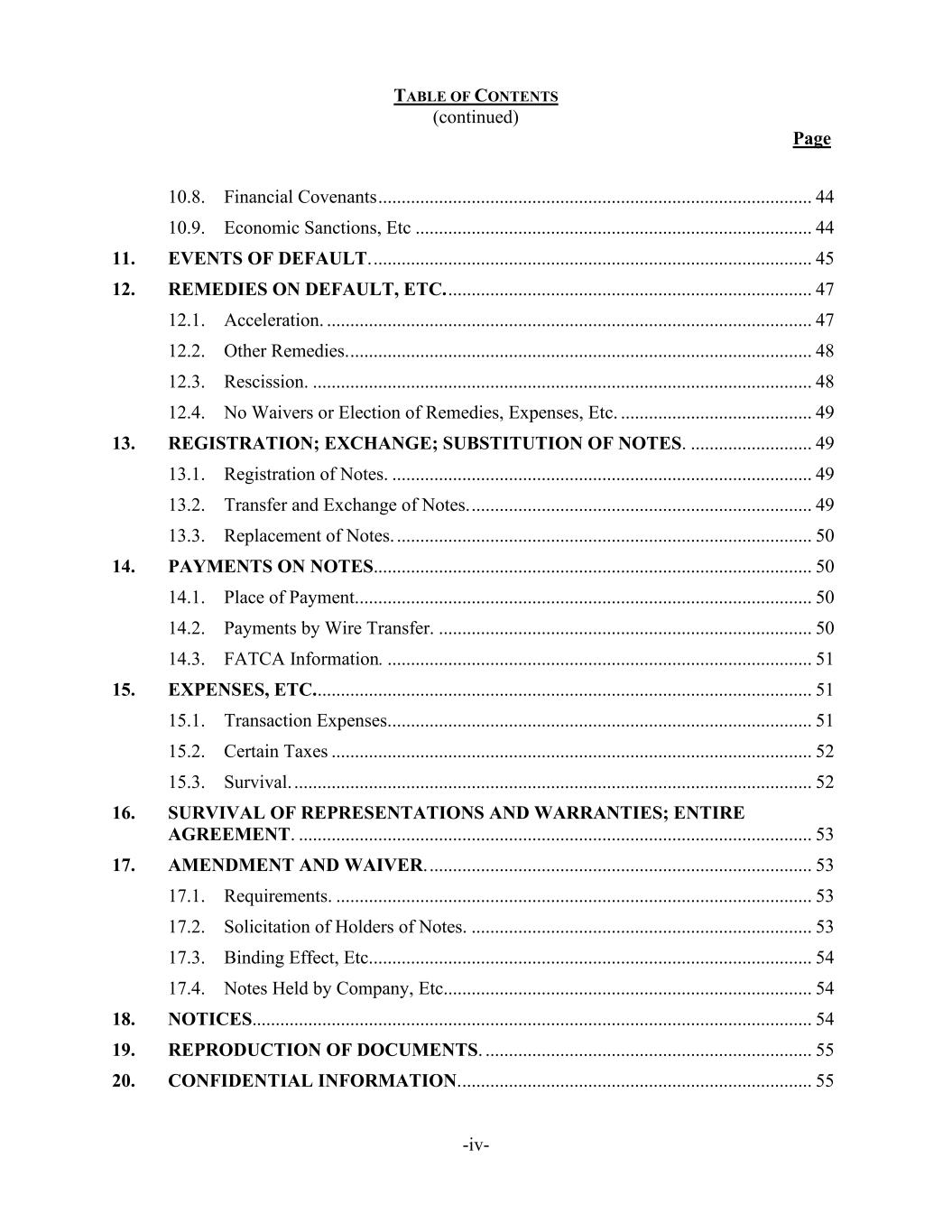 TABLE OF CONTENTS (continued) Page -iv- 10.8. Financial Covenants ............................................................................................. 44 10.9. Economic Sanctions, Etc ..................................................................................... 44 11. EVENTS OF DEFAULT. .............................................................................................. 45 12. REMEDIES ON DEFAULT, ETC. .............................................................................. 47 12.1. Acceleration. ........................................................................................................ 47 12.2. Other Remedies. ................................................................................................... 48 12.3. Rescission. ........................................................................................................... 48 12.4. No Waivers or Election of Remedies, Expenses, Etc. ......................................... 49 13. REGISTRATION; EXCHANGE; SUBSTITUTION OF NOTES. .......................... 49 13.1. Registration of Notes. .......................................................................................... 49 13.2. Transfer and Exchange of Notes. ......................................................................... 49 13.3. Replacement of Notes. ......................................................................................... 50 14. PAYMENTS ON NOTES.............................................................................................. 50 14.1. Place of Payment.................................................................................................. 50 14.2. Payments by Wire Transfer. ................................................................................ 50 14.3. FATCA Information. ........................................................................................... 51 15. EXPENSES, ETC. .......................................................................................................... 51 15.1. Transaction Expenses........................................................................................... 51 15.2. Certain Taxes ....................................................................................................... 52 15.3. Survival. ............................................................................................................... 52 16. SURVIVAL OF REPRESENTATIONS AND WARRANTIES; ENTIRE AGREEMENT. .............................................................................................................. 53 17. AMENDMENT AND WAIVER. .................................................................................. 53 17.1. Requirements. ...................................................................................................... 53 17.2. Solicitation of Holders of Notes. ......................................................................... 53 17.3. Binding Effect, Etc............................................................................................... 54 17.4. Notes Held by Company, Etc............................................................................... 54 18. NOTICES........................................................................................................................ 54 19. REPRODUCTION OF DOCUMENTS. ...................................................................... 55 20. CONFIDENTIAL INFORMATION. ........................................................................... 55