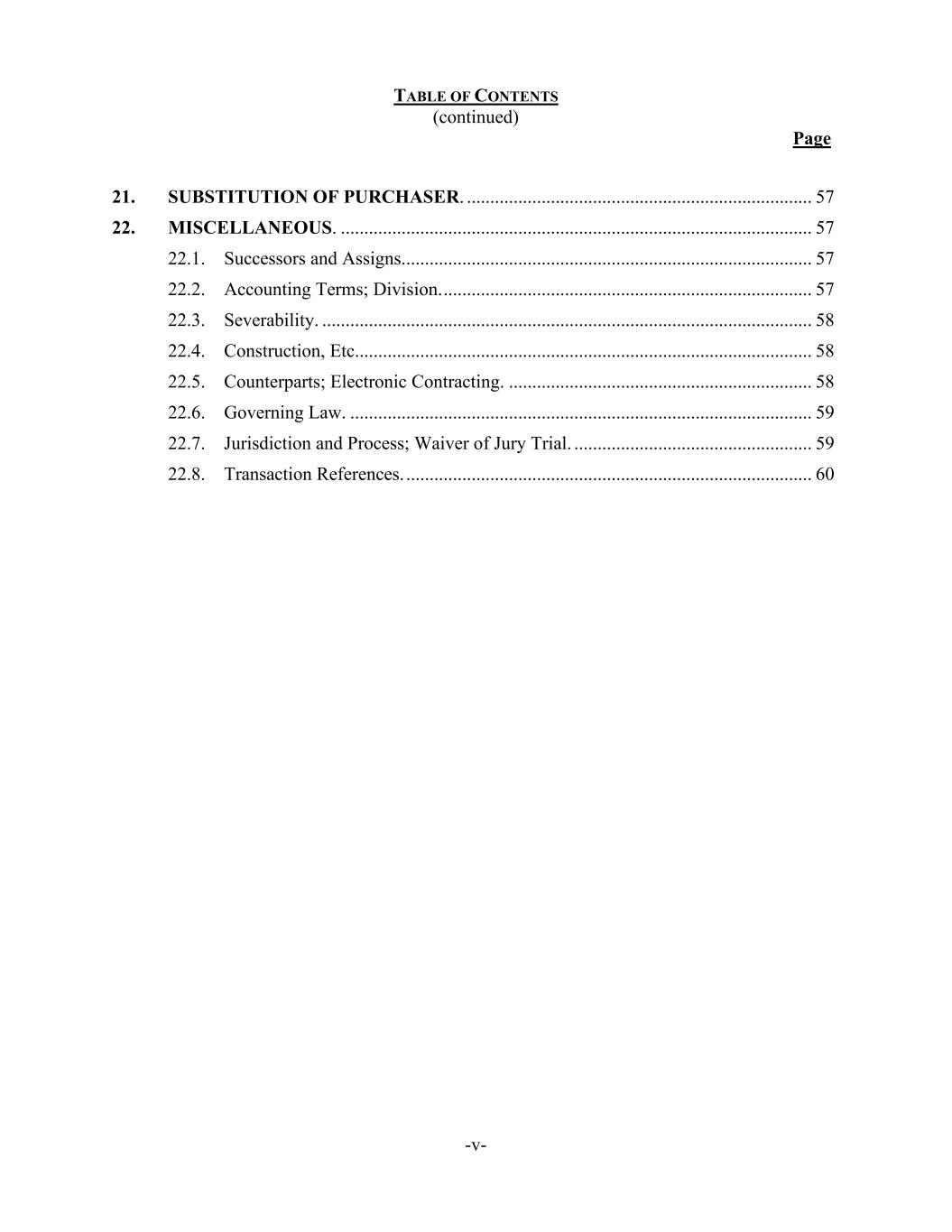 TABLE OF CONTENTS (continued) Page -v- 21. SUBSTITUTION OF PURCHASER. .......................................................................... 57 22. MISCELLANEOUS. ..................................................................................................... 57 22.1. Successors and Assigns........................................................................................ 57 22.2. Accounting Terms; Division. ............................................................................... 57 22.3. Severability. ......................................................................................................... 58 22.4. Construction, Etc.................................................................................................. 58 22.5. Counterparts; Electronic Contracting. ................................................................. 58 22.6. Governing Law. ................................................................................................... 59 22.7. Jurisdiction and Process; Waiver of Jury Trial. ................................................... 59 22.8. Transaction References. ....................................................................................... 60