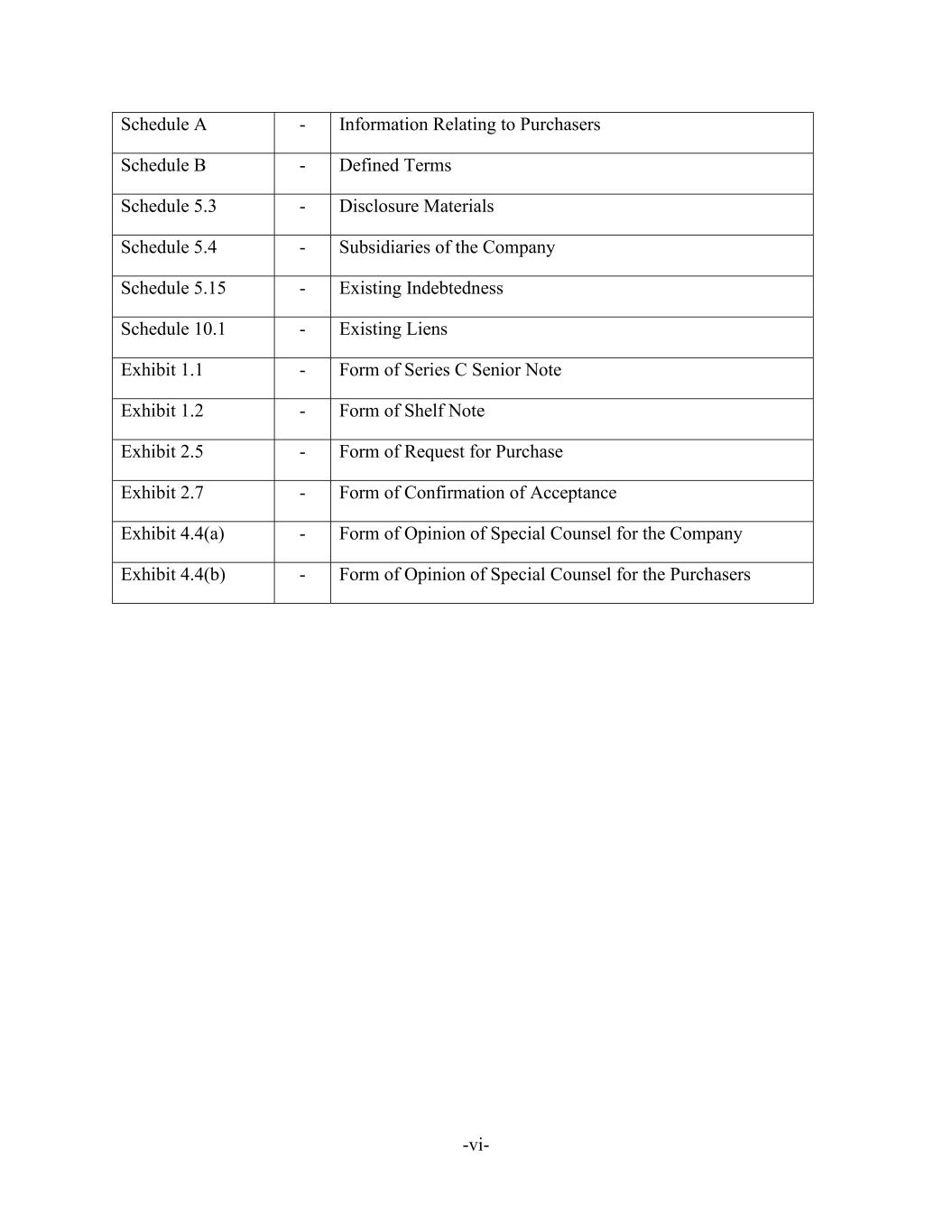 -vi- Schedule A - Information Relating to Purchasers Schedule B - Defined Terms Schedule 5.3 - Disclosure Materials Schedule 5.4 - Subsidiaries of the Company Schedule 5.15 - Existing Indebtedness Schedule 10.1 - Existing Liens Exhibit 1.1 - Form of Series C Senior Note Exhibit 1.2 - Form of Shelf Note Exhibit 2.5 - Form of Request for Purchase Exhibit 2.7 - Form of Confirmation of Acceptance Exhibit 4.4(a) - Form of Opinion of Special Counsel for the Company Exhibit 4.4(b) - Form of Opinion of Special Counsel for the Purchasers