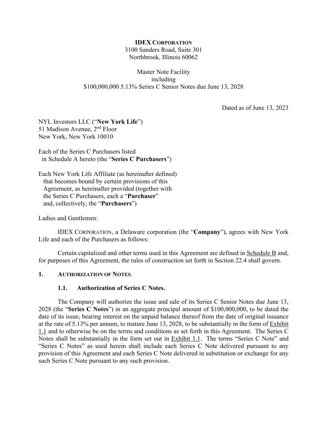 IDEX CORPORATION 3100 Sanders Road, Suite 301 Northbrook, Illinois 60062 Master Note Facility including $100,000,000 5.13% Series C Senior Notes due June 13, 2028 Dated as of June 13, 2023 NYL Investors LLC (“New York Life”) 51 Madison Avenue, 2nd Floor New York, New York 10010 Each of the Series C Purchasers listed in Schedule A hereto (the “Series C Purchasers”) Each New York Life Affiliate (as hereinafter defined) that becomes bound by certain provisions of this Agreement, as hereinafter provided (together with the Series C Purchasers, each a “Purchaser” and, collectively, the “Purchasers”) Ladies and Gentlemen: IDEX CORPORATION, a Delaware corporation (the “Company”), agrees with New York Life and each of the Purchasers as follows: Certain capitalized and other terms used in this Agreement are defined in Schedule B and, for purposes of this Agreement, the rules of construction set forth in Section 22.4 shall govern. 1. AUTHORIZATION OF NOTES. 1.1. Authorization of Series C Notes. The Company will authorize the issue and sale of its Series C Senior Notes due June 13, 2028 (the “Series C Notes”) in an aggregate principal amount of $100,000,000, to be dated the date of its issue, bearing interest on the unpaid balance thereof from the date of original issuance at the rate of 5.13% per annum, to mature June 13, 2028, to be substantially in the form of Exhibit 1.1 and to otherwise be on the terms and conditions as set forth in this Agreement. The Series C Notes shall be substantially in the form set out in Exhibit 1.1. The terms “Series C Note” and “Series C Notes” as used herein shall include each Series C Note delivered pursuant to any provision of this Agreement and each Series C Note delivered in substitution or exchange for any such Series C Note pursuant to any such provision.