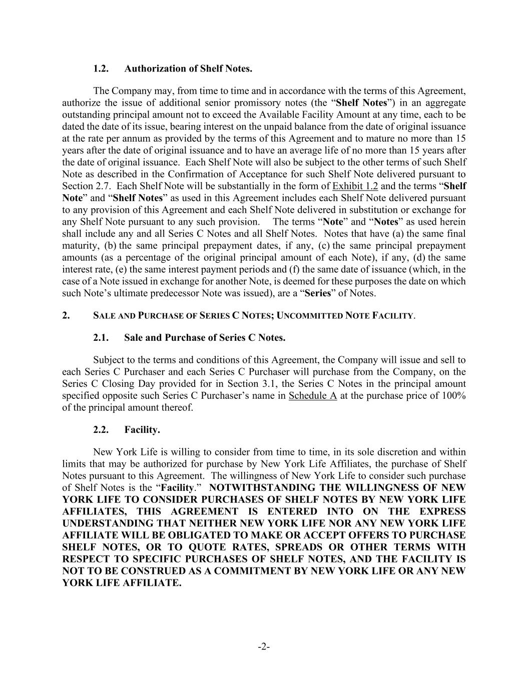 -2- 1.2. Authorization of Shelf Notes. The Company may, from time to time and in accordance with the terms of this Agreement, authorize the issue of additional senior promissory notes (the “Shelf Notes”) in an aggregate outstanding principal amount not to exceed the Available Facility Amount at any time, each to be dated the date of its issue, bearing interest on the unpaid balance from the date of original issuance at the rate per annum as provided by the terms of this Agreement and to mature no more than 15 years after the date of original issuance and to have an average life of no more than 15 years after the date of original issuance. Each Shelf Note will also be subject to the other terms of such Shelf Note as described in the Confirmation of Acceptance for such Shelf Note delivered pursuant to Section 2.7. Each Shelf Note will be substantially in the form of Exhibit 1.2 and the terms “Shelf Note” and “Shelf Notes” as used in this Agreement includes each Shelf Note delivered pursuant to any provision of this Agreement and each Shelf Note delivered in substitution or exchange for any Shelf Note pursuant to any such provision. The terms “Note” and “Notes” as used herein shall include any and all Series C Notes and all Shelf Notes. Notes that have (a) the same final maturity, (b) the same principal prepayment dates, if any, (c) the same principal prepayment amounts (as a percentage of the original principal amount of each Note), if any, (d) the same interest rate, (e) the same interest payment periods and (f) the same date of issuance (which, in the case of a Note issued in exchange for another Note, is deemed for these purposes the date on which such Note’s ultimate predecessor Note was issued), are a “Series” of Notes. 2. SALE AND PURCHASE OF SERIES C NOTES; UNCOMMITTED NOTE FACILITY. 2.1. Sale and Purchase of Series C Notes. Subject to the terms and conditions of this Agreement, the Company will issue and sell to each Series C Purchaser and each Series C Purchaser will purchase from the Company, on the Series C Closing Day provided for in Section 3.1, the Series C Notes in the principal amount specified opposite such Series C Purchaser’s name in Schedule A at the purchase price of 100% of the principal amount thereof. 2.2. Facility. New York Life is willing to consider from time to time, in its sole discretion and within limits that may be authorized for purchase by New York Life Affiliates, the purchase of Shelf Notes pursuant to this Agreement. The willingness of New York Life to consider such purchase of Shelf Notes is the “Facility.” NOTWITHSTANDING THE WILLINGNESS OF NEW YORK LIFE TO CONSIDER PURCHASES OF SHELF NOTES BY NEW YORK LIFE AFFILIATES, THIS AGREEMENT IS ENTERED INTO ON THE EXPRESS UNDERSTANDING THAT NEITHER NEW YORK LIFE NOR ANY NEW YORK LIFE AFFILIATE WILL BE OBLIGATED TO MAKE OR ACCEPT OFFERS TO PURCHASE SHELF NOTES, OR TO QUOTE RATES, SPREADS OR OTHER TERMS WITH RESPECT TO SPECIFIC PURCHASES OF SHELF NOTES, AND THE FACILITY IS NOT TO BE CONSTRUED AS A COMMITMENT BY NEW YORK LIFE OR ANY NEW YORK LIFE AFFILIATE.