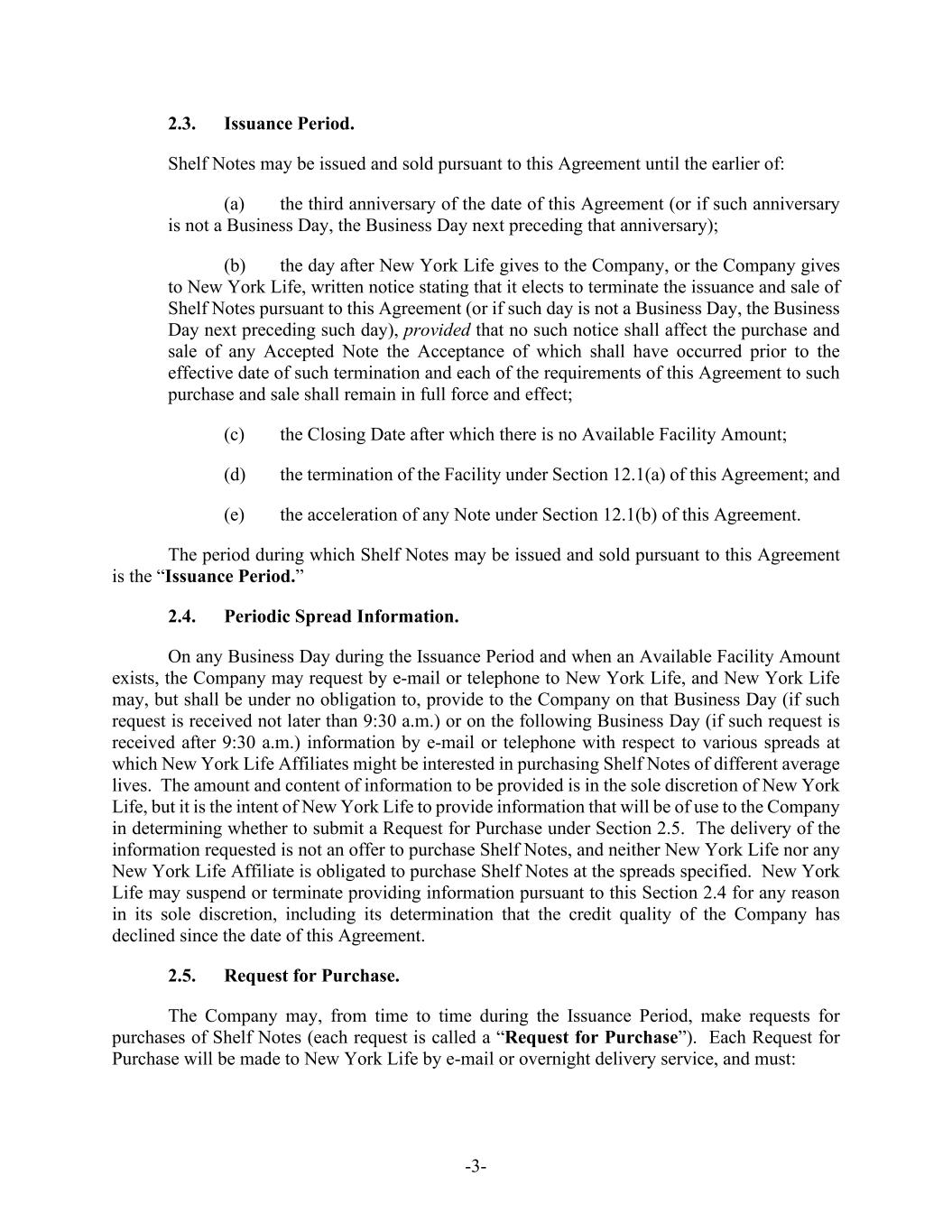 -3- 2.3. Issuance Period. Shelf Notes may be issued and sold pursuant to this Agreement until the earlier of: (a) the third anniversary of the date of this Agreement (or if such anniversary is not a Business Day, the Business Day next preceding that anniversary); (b) the day after New York Life gives to the Company, or the Company gives to New York Life, written notice stating that it elects to terminate the issuance and sale of Shelf Notes pursuant to this Agreement (or if such day is not a Business Day, the Business Day next preceding such day), provided that no such notice shall affect the purchase and sale of any Accepted Note the Acceptance of which shall have occurred prior to the effective date of such termination and each of the requirements of this Agreement to such purchase and sale shall remain in full force and effect; (c) the Closing Date after which there is no Available Facility Amount; (d) the termination of the Facility under Section 12.1(a) of this Agreement; and (e) the acceleration of any Note under Section 12.1(b) of this Agreement. The period during which Shelf Notes may be issued and sold pursuant to this Agreement is the “Issuance Period.” 2.4. Periodic Spread Information. On any Business Day during the Issuance Period and when an Available Facility Amount exists, the Company may request by e-mail or telephone to New York Life, and New York Life may, but shall be under no obligation to, provide to the Company on that Business Day (if such request is received not later than 9:30 a.m.) or on the following Business Day (if such request is received after 9:30 a.m.) information by e-mail or telephone with respect to various spreads at which New York Life Affiliates might be interested in purchasing Shelf Notes of different average lives. The amount and content of information to be provided is in the sole discretion of New York Life, but it is the intent of New York Life to provide information that will be of use to the Company in determining whether to submit a Request for Purchase under Section 2.5. The delivery of the information requested is not an offer to purchase Shelf Notes, and neither New York Life nor any New York Life Affiliate is obligated to purchase Shelf Notes at the spreads specified. New York Life may suspend or terminate providing information pursuant to this Section 2.4 for any reason in its sole discretion, including its determination that the credit quality of the Company has declined since the date of this Agreement. 2.5. Request for Purchase. The Company may, from time to time during the Issuance Period, make requests for purchases of Shelf Notes (each request is called a “Request for Purchase”). Each Request for Purchase will be made to New York Life by e-mail or overnight delivery service, and must: