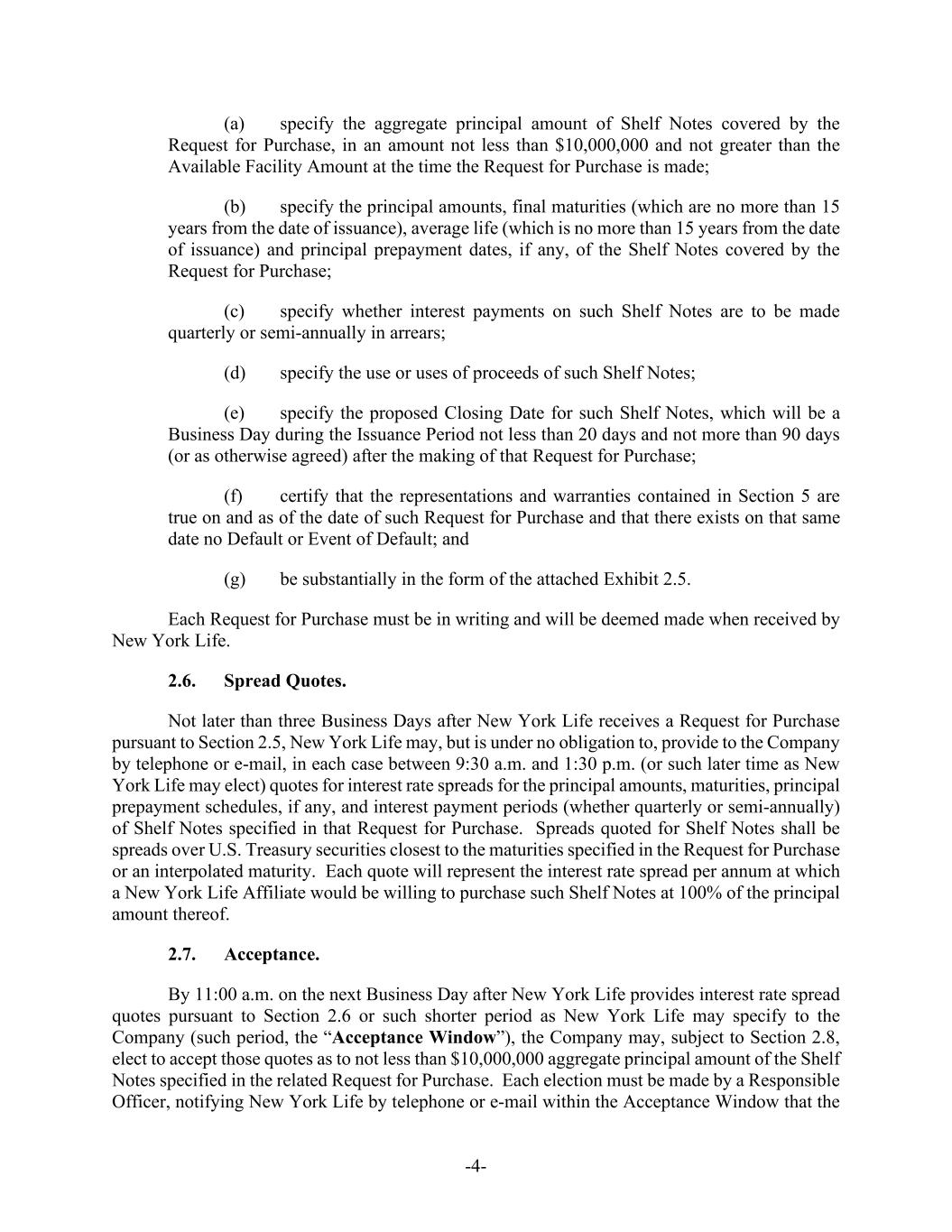 -4- (a) specify the aggregate principal amount of Shelf Notes covered by the Request for Purchase, in an amount not less than $10,000,000 and not greater than the Available Facility Amount at the time the Request for Purchase is made; (b) specify the principal amounts, final maturities (which are no more than 15 years from the date of issuance), average life (which is no more than 15 years from the date of issuance) and principal prepayment dates, if any, of the Shelf Notes covered by the Request for Purchase; (c) specify whether interest payments on such Shelf Notes are to be made quarterly or semi-annually in arrears; (d) specify the use or uses of proceeds of such Shelf Notes; (e) specify the proposed Closing Date for such Shelf Notes, which will be a Business Day during the Issuance Period not less than 20 days and not more than 90 days (or as otherwise agreed) after the making of that Request for Purchase; (f) certify that the representations and warranties contained in Section 5 are true on and as of the date of such Request for Purchase and that there exists on that same date no Default or Event of Default; and (g) be substantially in the form of the attached Exhibit 2.5. Each Request for Purchase must be in writing and will be deemed made when received by New York Life. 2.6. Spread Quotes. Not later than three Business Days after New York Life receives a Request for Purchase pursuant to Section 2.5, New York Life may, but is under no obligation to, provide to the Company by telephone or e-mail, in each case between 9:30 a.m. and 1:30 p.m. (or such later time as New York Life may elect) quotes for interest rate spreads for the principal amounts, maturities, principal prepayment schedules, if any, and interest payment periods (whether quarterly or semi-annually) of Shelf Notes specified in that Request for Purchase. Spreads quoted for Shelf Notes shall be spreads over U.S. Treasury securities closest to the maturities specified in the Request for Purchase or an interpolated maturity. Each quote will represent the interest rate spread per annum at which a New York Life Affiliate would be willing to purchase such Shelf Notes at 100% of the principal amount thereof. 2.7. Acceptance. By 11:00 a.m. on the next Business Day after New York Life provides interest rate spread quotes pursuant to Section 2.6 or such shorter period as New York Life may specify to the Company (such period, the “Acceptance Window”), the Company may, subject to Section 2.8, elect to accept those quotes as to not less than $10,000,000 aggregate principal amount of the Shelf Notes specified in the related Request for Purchase. Each election must be made by a Responsible Officer, notifying New York Life by telephone or e-mail within the Acceptance Window that the