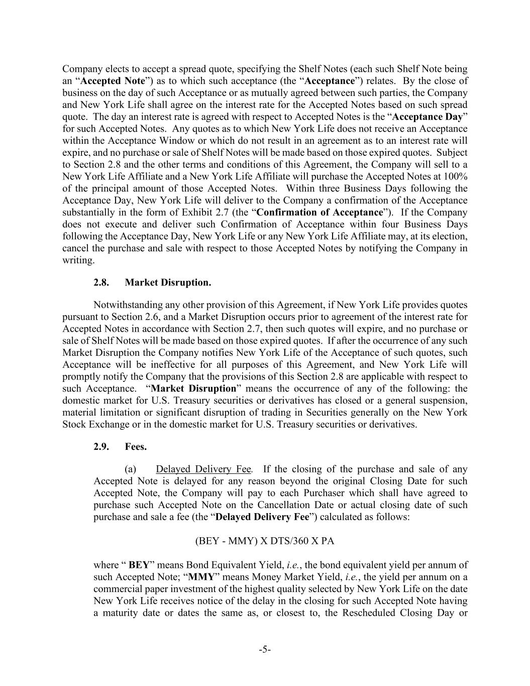 -5- Company elects to accept a spread quote, specifying the Shelf Notes (each such Shelf Note being an “Accepted Note”) as to which such acceptance (the “Acceptance”) relates. By the close of business on the day of such Acceptance or as mutually agreed between such parties, the Company and New York Life shall agree on the interest rate for the Accepted Notes based on such spread quote. The day an interest rate is agreed with respect to Accepted Notes is the “Acceptance Day” for such Accepted Notes. Any quotes as to which New York Life does not receive an Acceptance within the Acceptance Window or which do not result in an agreement as to an interest rate will expire, and no purchase or sale of Shelf Notes will be made based on those expired quotes. Subject to Section 2.8 and the other terms and conditions of this Agreement, the Company will sell to a New York Life Affiliate and a New York Life Affiliate will purchase the Accepted Notes at 100% of the principal amount of those Accepted Notes. Within three Business Days following the Acceptance Day, New York Life will deliver to the Company a confirmation of the Acceptance substantially in the form of Exhibit 2.7 (the “Confirmation of Acceptance”). If the Company does not execute and deliver such Confirmation of Acceptance within four Business Days following the Acceptance Day, New York Life or any New York Life Affiliate may, at its election, cancel the purchase and sale with respect to those Accepted Notes by notifying the Company in writing. 2.8. Market Disruption. Notwithstanding any other provision of this Agreement, if New York Life provides quotes pursuant to Section 2.6, and a Market Disruption occurs prior to agreement of the interest rate for Accepted Notes in accordance with Section 2.7, then such quotes will expire, and no purchase or sale of Shelf Notes will be made based on those expired quotes. If after the occurrence of any such Market Disruption the Company notifies New York Life of the Acceptance of such quotes, such Acceptance will be ineffective for all purposes of this Agreement, and New York Life will promptly notify the Company that the provisions of this Section 2.8 are applicable with respect to such Acceptance. “Market Disruption” means the occurrence of any of the following: the domestic market for U.S. Treasury securities or derivatives has closed or a general suspension, material limitation or significant disruption of trading in Securities generally on the New York Stock Exchange or in the domestic market for U.S. Treasury securities or derivatives. 2.9. Fees. (a) Delayed Delivery Fee. If the closing of the purchase and sale of any Accepted Note is delayed for any reason beyond the original Closing Date for such Accepted Note, the Company will pay to each Purchaser which shall have agreed to purchase such Accepted Note on the Cancellation Date or actual closing date of such purchase and sale a fee (the “Delayed Delivery Fee”) calculated as follows: (BEY - MMY) X DTS/360 X PA where “ BEY” means Bond Equivalent Yield, i.e., the bond equivalent yield per annum of such Accepted Note; “MMY” means Money Market Yield, i.e., the yield per annum on a commercial paper investment of the highest quality selected by New York Life on the date New York Life receives notice of the delay in the closing for such Accepted Note having a maturity date or dates the same as, or closest to, the Rescheduled Closing Day or