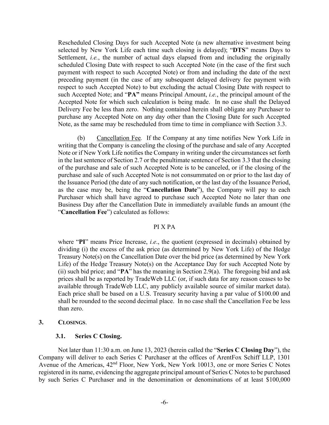 -6- Rescheduled Closing Days for such Accepted Note (a new alternative investment being selected by New York Life each time such closing is delayed); “DTS” means Days to Settlement, i.e., the number of actual days elapsed from and including the originally scheduled Closing Date with respect to such Accepted Note (in the case of the first such payment with respect to such Accepted Note) or from and including the date of the next preceding payment (in the case of any subsequent delayed delivery fee payment with respect to such Accepted Note) to but excluding the actual Closing Date with respect to such Accepted Note; and “PA” means Principal Amount, i.e., the principal amount of the Accepted Note for which such calculation is being made. In no case shall the Delayed Delivery Fee be less than zero. Nothing contained herein shall obligate any Purchaser to purchase any Accepted Note on any day other than the Closing Date for such Accepted Note, as the same may be rescheduled from time to time in compliance with Section 3.3. (b) Cancellation Fee. If the Company at any time notifies New York Life in writing that the Company is canceling the closing of the purchase and sale of any Accepted Note or if New York Life notifies the Company in writing under the circumstances set forth in the last sentence of Section 2.7 or the penultimate sentence of Section 3.3 that the closing of the purchase and sale of such Accepted Note is to be canceled, or if the closing of the purchase and sale of such Accepted Note is not consummated on or prior to the last day of the Issuance Period (the date of any such notification, or the last day of the Issuance Period, as the case may be, being the “Cancellation Date”), the Company will pay to each Purchaser which shall have agreed to purchase such Accepted Note no later than one Business Day after the Cancellation Date in immediately available funds an amount (the “Cancellation Fee”) calculated as follows: PI X PA where “PI” means Price Increase, i.e., the quotient (expressed in decimals) obtained by dividing (i) the excess of the ask price (as determined by New York Life) of the Hedge Treasury Note(s) on the Cancellation Date over the bid price (as determined by New York Life) of the Hedge Treasury Note(s) on the Acceptance Day for such Accepted Note by (ii) such bid price; and “PA” has the meaning in Section 2.9(a). The foregoing bid and ask prices shall be as reported by TradeWeb LLC (or, if such data for any reason ceases to be available through TradeWeb LLC, any publicly available source of similar market data). Each price shall be based on a U.S. Treasury security having a par value of $100.00 and shall be rounded to the second decimal place. In no case shall the Cancellation Fee be less than zero. 3. CLOSINGS. 3.1. Series C Closing. Not later than 11:30 a.m. on June 13, 2023 (herein called the “Series C Closing Day”), the Company will deliver to each Series C Purchaser at the offices of ArentFox Schiff LLP, 1301 Avenue of the Americas, 42nd Floor, New York, New York 10013, one or more Series C Notes registered in its name, evidencing the aggregate principal amount of Series C Notes to be purchased by such Series C Purchaser and in the denomination or denominations of at least $100,000