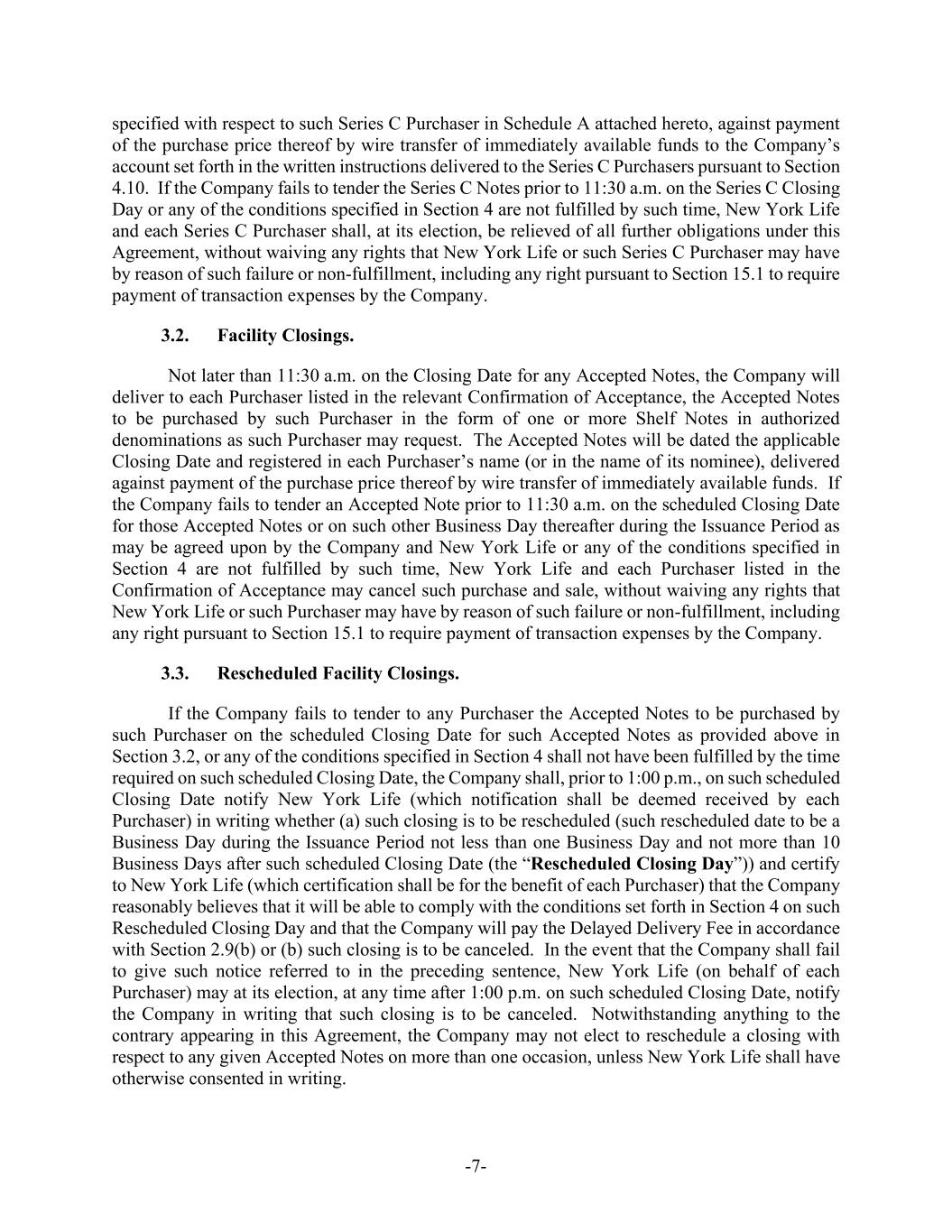 -7- specified with respect to such Series C Purchaser in Schedule A attached hereto, against payment of the purchase price thereof by wire transfer of immediately available funds to the Company’s account set forth in the written instructions delivered to the Series C Purchasers pursuant to Section 4.10. If the Company fails to tender the Series C Notes prior to 11:30 a.m. on the Series C Closing Day or any of the conditions specified in Section 4 are not fulfilled by such time, New York Life and each Series C Purchaser shall, at its election, be relieved of all further obligations under this Agreement, without waiving any rights that New York Life or such Series C Purchaser may have by reason of such failure or non-fulfillment, including any right pursuant to Section 15.1 to require payment of transaction expenses by the Company. 3.2. Facility Closings. Not later than 11:30 a.m. on the Closing Date for any Accepted Notes, the Company will deliver to each Purchaser listed in the relevant Confirmation of Acceptance, the Accepted Notes to be purchased by such Purchaser in the form of one or more Shelf Notes in authorized denominations as such Purchaser may request. The Accepted Notes will be dated the applicable Closing Date and registered in each Purchaser’s name (or in the name of its nominee), delivered against payment of the purchase price thereof by wire transfer of immediately available funds. If the Company fails to tender an Accepted Note prior to 11:30 a.m. on the scheduled Closing Date for those Accepted Notes or on such other Business Day thereafter during the Issuance Period as may be agreed upon by the Company and New York Life or any of the conditions specified in Section 4 are not fulfilled by such time, New York Life and each Purchaser listed in the Confirmation of Acceptance may cancel such purchase and sale, without waiving any rights that New York Life or such Purchaser may have by reason of such failure or non-fulfillment, including any right pursuant to Section 15.1 to require payment of transaction expenses by the Company. 3.3. Rescheduled Facility Closings. If the Company fails to tender to any Purchaser the Accepted Notes to be purchased by such Purchaser on the scheduled Closing Date for such Accepted Notes as provided above in Section 3.2, or any of the conditions specified in Section 4 shall not have been fulfilled by the time required on such scheduled Closing Date, the Company shall, prior to 1:00 p.m., on such scheduled Closing Date notify New York Life (which notification shall be deemed received by each Purchaser) in writing whether (a) such closing is to be rescheduled (such rescheduled date to be a Business Day during the Issuance Period not less than one Business Day and not more than 10 Business Days after such scheduled Closing Date (the “Rescheduled Closing Day”)) and certify to New York Life (which certification shall be for the benefit of each Purchaser) that the Company reasonably believes that it will be able to comply with the conditions set forth in Section 4 on such Rescheduled Closing Day and that the Company will pay the Delayed Delivery Fee in accordance with Section 2.9(b) or (b) such closing is to be canceled. In the event that the Company shall fail to give such notice referred to in the preceding sentence, New York Life (on behalf of each Purchaser) may at its election, at any time after 1:00 p.m. on such scheduled Closing Date, notify the Company in writing that such closing is to be canceled. Notwithstanding anything to the contrary appearing in this Agreement, the Company may not elect to reschedule a closing with respect to any given Accepted Notes on more than one occasion, unless New York Life shall have otherwise consented in writing.