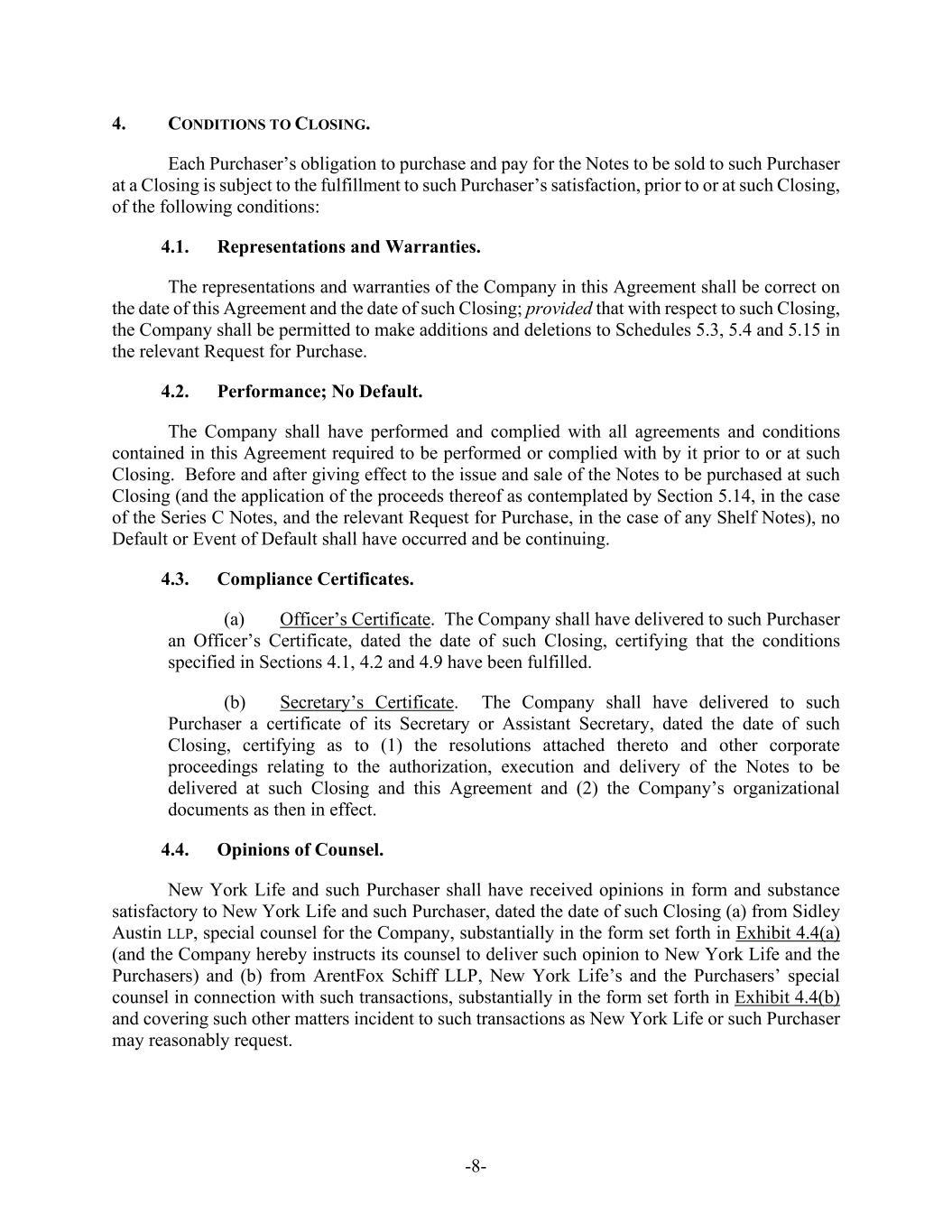 -8- 4. CONDITIONS TO CLOSING. Each Purchaser’s obligation to purchase and pay for the Notes to be sold to such Purchaser at a Closing is subject to the fulfillment to such Purchaser’s satisfaction, prior to or at such Closing, of the following conditions: 4.1. Representations and Warranties. The representations and warranties of the Company in this Agreement shall be correct on the date of this Agreement and the date of such Closing; provided that with respect to such Closing, the Company shall be permitted to make additions and deletions to Schedules 5.3, 5.4 and 5.15 in the relevant Request for Purchase. 4.2. Performance; No Default. The Company shall have performed and complied with all agreements and conditions contained in this Agreement required to be performed or complied with by it prior to or at such Closing. Before and after giving effect to the issue and sale of the Notes to be purchased at such Closing (and the application of the proceeds thereof as contemplated by Section 5.14, in the case of the Series C Notes, and the relevant Request for Purchase, in the case of any Shelf Notes), no Default or Event of Default shall have occurred and be continuing. 4.3. Compliance Certificates. (a) Officer’s Certificate. The Company shall have delivered to such Purchaser an Officer’s Certificate, dated the date of such Closing, certifying that the conditions specified in Sections 4.1, 4.2 and 4.9 have been fulfilled. (b) Secretary’s Certificate. The Company shall have delivered to such Purchaser a certificate of its Secretary or Assistant Secretary, dated the date of such Closing, certifying as to (1) the resolutions attached thereto and other corporate proceedings relating to the authorization, execution and delivery of the Notes to be delivered at such Closing and this Agreement and (2) the Company’s organizational documents as then in effect. 4.4. Opinions of Counsel. New York Life and such Purchaser shall have received opinions in form and substance satisfactory to New York Life and such Purchaser, dated the date of such Closing (a) from Sidley Austin LLP, special counsel for the Company, substantially in the form set forth in Exhibit 4.4(a) (and the Company hereby instructs its counsel to deliver such opinion to New York Life and the Purchasers) and (b) from ArentFox Schiff LLP, New York Life’s and the Purchasers’ special counsel in connection with such transactions, substantially in the form set forth in Exhibit 4.4(b) and covering such other matters incident to such transactions as New York Life or such Purchaser may reasonably request.