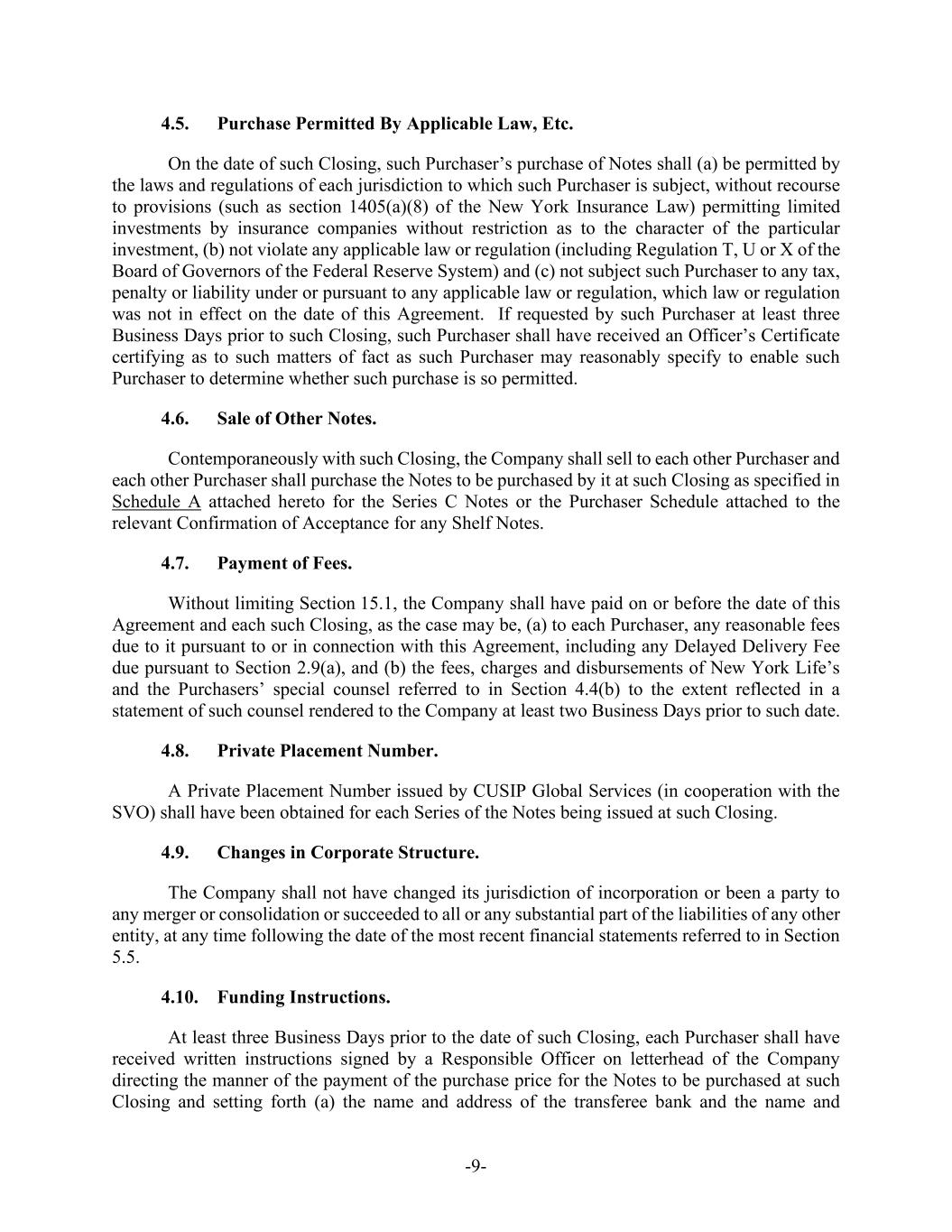 -9- 4.5. Purchase Permitted By Applicable Law, Etc. On the date of such Closing, such Purchaser’s purchase of Notes shall (a) be permitted by the laws and regulations of each jurisdiction to which such Purchaser is subject, without recourse to provisions (such as section 1405(a)(8) of the New York Insurance Law) permitting limited investments by insurance companies without restriction as to the character of the particular investment, (b) not violate any applicable law or regulation (including Regulation T, U or X of the Board of Governors of the Federal Reserve System) and (c) not subject such Purchaser to any tax, penalty or liability under or pursuant to any applicable law or regulation, which law or regulation was not in effect on the date of this Agreement. If requested by such Purchaser at least three Business Days prior to such Closing, such Purchaser shall have received an Officer’s Certificate certifying as to such matters of fact as such Purchaser may reasonably specify to enable such Purchaser to determine whether such purchase is so permitted. 4.6. Sale of Other Notes. Contemporaneously with such Closing, the Company shall sell to each other Purchaser and each other Purchaser shall purchase the Notes to be purchased by it at such Closing as specified in Schedule A attached hereto for the Series C Notes or the Purchaser Schedule attached to the relevant Confirmation of Acceptance for any Shelf Notes. 4.7. Payment of Fees. Without limiting Section 15.1, the Company shall have paid on or before the date of this Agreement and each such Closing, as the case may be, (a) to each Purchaser, any reasonable fees due to it pursuant to or in connection with this Agreement, including any Delayed Delivery Fee due pursuant to Section 2.9(a), and (b) the fees, charges and disbursements of New York Life’s and the Purchasers’ special counsel referred to in Section 4.4(b) to the extent reflected in a statement of such counsel rendered to the Company at least two Business Days prior to such date. 4.8. Private Placement Number. A Private Placement Number issued by CUSIP Global Services (in cooperation with the SVO) shall have been obtained for each Series of the Notes being issued at such Closing. 4.9. Changes in Corporate Structure. The Company shall not have changed its jurisdiction of incorporation or been a party to any merger or consolidation or succeeded to all or any substantial part of the liabilities of any other entity, at any time following the date of the most recent financial statements referred to in Section 5.5. 4.10. Funding Instructions. At least three Business Days prior to the date of such Closing, each Purchaser shall have received written instructions signed by a Responsible Officer on letterhead of the Company directing the manner of the payment of the purchase price for the Notes to be purchased at such Closing and setting forth (a) the name and address of the transferee bank and the name and