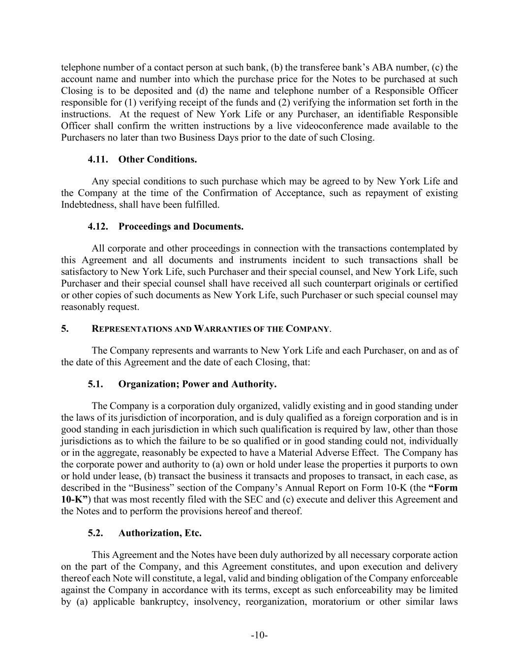 -10- telephone number of a contact person at such bank, (b) the transferee bank’s ABA number, (c) the account name and number into which the purchase price for the Notes to be purchased at such Closing is to be deposited and (d) the name and telephone number of a Responsible Officer responsible for (1) verifying receipt of the funds and (2) verifying the information set forth in the instructions. At the request of New York Life or any Purchaser, an identifiable Responsible Officer shall confirm the written instructions by a live videoconference made available to the Purchasers no later than two Business Days prior to the date of such Closing. 4.11. Other Conditions. Any special conditions to such purchase which may be agreed to by New York Life and the Company at the time of the Confirmation of Acceptance, such as repayment of existing Indebtedness, shall have been fulfilled. 4.12. Proceedings and Documents. All corporate and other proceedings in connection with the transactions contemplated by this Agreement and all documents and instruments incident to such transactions shall be satisfactory to New York Life, such Purchaser and their special counsel, and New York Life, such Purchaser and their special counsel shall have received all such counterpart originals or certified or other copies of such documents as New York Life, such Purchaser or such special counsel may reasonably request. 5. REPRESENTATIONS AND WARRANTIES OF THE COMPANY. The Company represents and warrants to New York Life and each Purchaser, on and as of the date of this Agreement and the date of each Closing, that: 5.1. Organization; Power and Authority. The Company is a corporation duly organized, validly existing and in good standing under the laws of its jurisdiction of incorporation, and is duly qualified as a foreign corporation and is in good standing in each jurisdiction in which such qualification is required by law, other than those jurisdictions as to which the failure to be so qualified or in good standing could not, individually or in the aggregate, reasonably be expected to have a Material Adverse Effect. The Company has the corporate power and authority to (a) own or hold under lease the properties it purports to own or hold under lease, (b) transact the business it transacts and proposes to transact, in each case, as described in the “Business” section of the Company’s Annual Report on Form 10-K (the “Form 10-K”) that was most recently filed with the SEC and (c) execute and deliver this Agreement and the Notes and to perform the provisions hereof and thereof. 5.2. Authorization, Etc. This Agreement and the Notes have been duly authorized by all necessary corporate action on the part of the Company, and this Agreement constitutes, and upon execution and delivery thereof each Note will constitute, a legal, valid and binding obligation of the Company enforceable against the Company in accordance with its terms, except as such enforceability may be limited by (a) applicable bankruptcy, insolvency, reorganization, moratorium or other similar laws