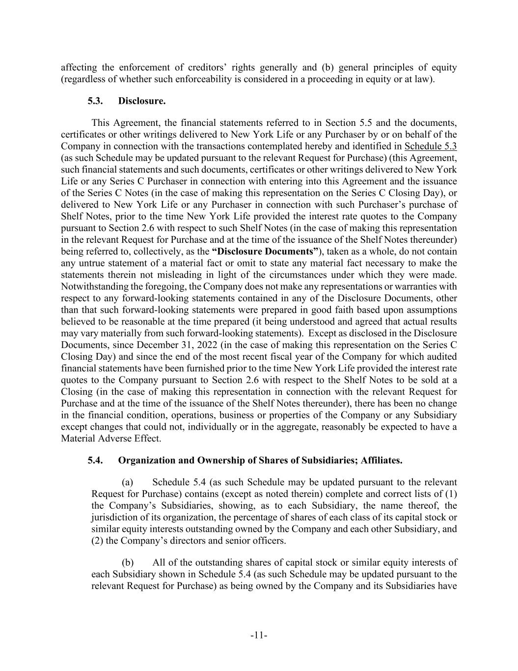 -11- affecting the enforcement of creditors’ rights generally and (b) general principles of equity (regardless of whether such enforceability is considered in a proceeding in equity or at law). 5.3. Disclosure. This Agreement, the financial statements referred to in Section 5.5 and the documents, certificates or other writings delivered to New York Life or any Purchaser by or on behalf of the Company in connection with the transactions contemplated hereby and identified in Schedule 5.3 (as such Schedule may be updated pursuant to the relevant Request for Purchase) (this Agreement, such financial statements and such documents, certificates or other writings delivered to New York Life or any Series C Purchaser in connection with entering into this Agreement and the issuance of the Series C Notes (in the case of making this representation on the Series C Closing Day), or delivered to New York Life or any Purchaser in connection with such Purchaser’s purchase of Shelf Notes, prior to the time New York Life provided the interest rate quotes to the Company pursuant to Section 2.6 with respect to such Shelf Notes (in the case of making this representation in the relevant Request for Purchase and at the time of the issuance of the Shelf Notes thereunder) being referred to, collectively, as the “Disclosure Documents”), taken as a whole, do not contain any untrue statement of a material fact or omit to state any material fact necessary to make the statements therein not misleading in light of the circumstances under which they were made. Notwithstanding the foregoing, the Company does not make any representations or warranties with respect to any forward-looking statements contained in any of the Disclosure Documents, other than that such forward-looking statements were prepared in good faith based upon assumptions believed to be reasonable at the time prepared (it being understood and agreed that actual results may vary materially from such forward-looking statements). Except as disclosed in the Disclosure Documents, since December 31, 2022 (in the case of making this representation on the Series C Closing Day) and since the end of the most recent fiscal year of the Company for which audited financial statements have been furnished prior to the time New York Life provided the interest rate quotes to the Company pursuant to Section 2.6 with respect to the Shelf Notes to be sold at a Closing (in the case of making this representation in connection with the relevant Request for Purchase and at the time of the issuance of the Shelf Notes thereunder), there has been no change in the financial condition, operations, business or properties of the Company or any Subsidiary except changes that could not, individually or in the aggregate, reasonably be expected to have a Material Adverse Effect. 5.4. Organization and Ownership of Shares of Subsidiaries; Affiliates. (a) Schedule 5.4 (as such Schedule may be updated pursuant to the relevant Request for Purchase) contains (except as noted therein) complete and correct lists of (1) the Company’s Subsidiaries, showing, as to each Subsidiary, the name thereof, the jurisdiction of its organization, the percentage of shares of each class of its capital stock or similar equity interests outstanding owned by the Company and each other Subsidiary, and (2) the Company’s directors and senior officers. (b) All of the outstanding shares of capital stock or similar equity interests of each Subsidiary shown in Schedule 5.4 (as such Schedule may be updated pursuant to the relevant Request for Purchase) as being owned by the Company and its Subsidiaries have
