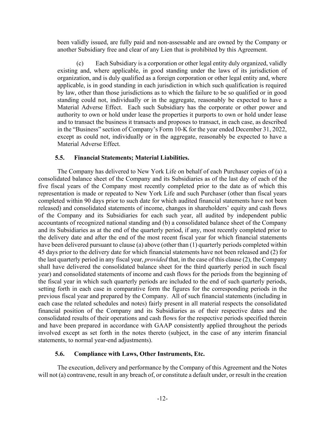 -12- been validly issued, are fully paid and non-assessable and are owned by the Company or another Subsidiary free and clear of any Lien that is prohibited by this Agreement. (c) Each Subsidiary is a corporation or other legal entity duly organized, validly existing and, where applicable, in good standing under the laws of its jurisdiction of organization, and is duly qualified as a foreign corporation or other legal entity and, where applicable, is in good standing in each jurisdiction in which such qualification is required by law, other than those jurisdictions as to which the failure to be so qualified or in good standing could not, individually or in the aggregate, reasonably be expected to have a Material Adverse Effect. Each such Subsidiary has the corporate or other power and authority to own or hold under lease the properties it purports to own or hold under lease and to transact the business it transacts and proposes to transact, in each case, as described in the “Business” section of Company’s Form 10-K for the year ended December 31, 2022, except as could not, individually or in the aggregate, reasonably be expected to have a Material Adverse Effect. 5.5. Financial Statements; Material Liabilities. The Company has delivered to New York Life on behalf of each Purchaser copies of (a) a consolidated balance sheet of the Company and its Subsidiaries as of the last day of each of the five fiscal years of the Company most recently completed prior to the date as of which this representation is made or repeated to New York Life and such Purchaser (other than fiscal years completed within 90 days prior to such date for which audited financial statements have not been released) and consolidated statements of income, changes in shareholders’ equity and cash flows of the Company and its Subsidiaries for each such year, all audited by independent public accountants of recognized national standing and (b) a consolidated balance sheet of the Company and its Subsidiaries as at the end of the quarterly period, if any, most recently completed prior to the delivery date and after the end of the most recent fiscal year for which financial statements have been delivered pursuant to clause (a) above (other than (1) quarterly periods completed within 45 days prior to the delivery date for which financial statements have not been released and (2) for the last quarterly period in any fiscal year, provided that, in the case of this clause (2), the Company shall have delivered the consolidated balance sheet for the third quarterly period in such fiscal year) and consolidated statements of income and cash flows for the periods from the beginning of the fiscal year in which such quarterly periods are included to the end of such quarterly periods, setting forth in each case in comparative form the figures for the corresponding periods in the previous fiscal year and prepared by the Company. All of such financial statements (including in each case the related schedules and notes) fairly present in all material respects the consolidated financial position of the Company and its Subsidiaries as of their respective dates and the consolidated results of their operations and cash flows for the respective periods specified therein and have been prepared in accordance with GAAP consistently applied throughout the periods involved except as set forth in the notes thereto (subject, in the case of any interim financial statements, to normal year-end adjustments). 5.6. Compliance with Laws, Other Instruments, Etc. The execution, delivery and performance by the Company of this Agreement and the Notes will not (a) contravene, result in any breach of, or constitute a default under, or result in the creation