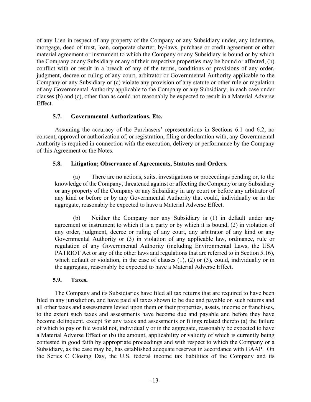 -13- of any Lien in respect of any property of the Company or any Subsidiary under, any indenture, mortgage, deed of trust, loan, corporate charter, by-laws, purchase or credit agreement or other material agreement or instrument to which the Company or any Subsidiary is bound or by which the Company or any Subsidiary or any of their respective properties may be bound or affected, (b) conflict with or result in a breach of any of the terms, conditions or provisions of any order, judgment, decree or ruling of any court, arbitrator or Governmental Authority applicable to the Company or any Subsidiary or (c) violate any provision of any statute or other rule or regulation of any Governmental Authority applicable to the Company or any Subsidiary; in each case under clauses (b) and (c), other than as could not reasonably be expected to result in a Material Adverse Effect. 5.7. Governmental Authorizations, Etc. Assuming the accuracy of the Purchasers’ representations in Sections 6.1 and 6.2, no consent, approval or authorization of, or registration, filing or declaration with, any Governmental Authority is required in connection with the execution, delivery or performance by the Company of this Agreement or the Notes. 5.8. Litigation; Observance of Agreements, Statutes and Orders. (a) There are no actions, suits, investigations or proceedings pending or, to the knowledge of the Company, threatened against or affecting the Company or any Subsidiary or any property of the Company or any Subsidiary in any court or before any arbitrator of any kind or before or by any Governmental Authority that could, individually or in the aggregate, reasonably be expected to have a Material Adverse Effect. (b) Neither the Company nor any Subsidiary is (1) in default under any agreement or instrument to which it is a party or by which it is bound, (2) in violation of any order, judgment, decree or ruling of any court, any arbitrator of any kind or any Governmental Authority or (3) in violation of any applicable law, ordinance, rule or regulation of any Governmental Authority (including Environmental Laws, the USA PATRIOT Act or any of the other laws and regulations that are referred to in Section 5.16), which default or violation, in the case of clauses (1), (2) or (3), could, individually or in the aggregate, reasonably be expected to have a Material Adverse Effect. 5.9. Taxes. The Company and its Subsidiaries have filed all tax returns that are required to have been filed in any jurisdiction, and have paid all taxes shown to be due and payable on such returns and all other taxes and assessments levied upon them or their properties, assets, income or franchises, to the extent such taxes and assessments have become due and payable and before they have become delinquent, except for any taxes and assessments or filings related thereto (a) the failure of which to pay or file would not, individually or in the aggregate, reasonably be expected to have a Material Adverse Effect or (b) the amount, applicability or validity of which is currently being contested in good faith by appropriate proceedings and with respect to which the Company or a Subsidiary, as the case may be, has established adequate reserves in accordance with GAAP. On the Series C Closing Day, the U.S. federal income tax liabilities of the Company and its