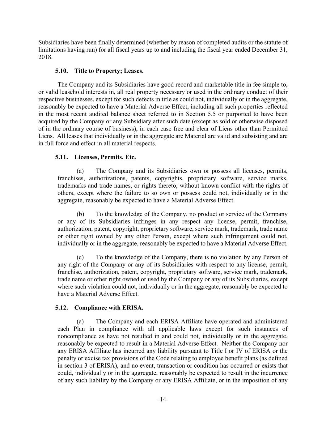 -14- Subsidiaries have been finally determined (whether by reason of completed audits or the statute of limitations having run) for all fiscal years up to and including the fiscal year ended December 31, 2018. 5.10. Title to Property; Leases. The Company and its Subsidiaries have good record and marketable title in fee simple to, or valid leasehold interests in, all real property necessary or used in the ordinary conduct of their respective businesses, except for such defects in title as could not, individually or in the aggregate, reasonably be expected to have a Material Adverse Effect, including all such properties reflected in the most recent audited balance sheet referred to in Section 5.5 or purported to have been acquired by the Company or any Subsidiary after such date (except as sold or otherwise disposed of in the ordinary course of business), in each case free and clear of Liens other than Permitted Liens. All leases that individually or in the aggregate are Material are valid and subsisting and are in full force and effect in all material respects. 5.11. Licenses, Permits, Etc. (a) The Company and its Subsidiaries own or possess all licenses, permits, franchises, authorizations, patents, copyrights, proprietary software, service marks, trademarks and trade names, or rights thereto, without known conflict with the rights of others, except where the failure to so own or possess could not, individually or in the aggregate, reasonably be expected to have a Material Adverse Effect. (b) To the knowledge of the Company, no product or service of the Company or any of its Subsidiaries infringes in any respect any license, permit, franchise, authorization, patent, copyright, proprietary software, service mark, trademark, trade name or other right owned by any other Person, except where such infringement could not, individually or in the aggregate, reasonably be expected to have a Material Adverse Effect. (c) To the knowledge of the Company, there is no violation by any Person of any right of the Company or any of its Subsidiaries with respect to any license, permit, franchise, authorization, patent, copyright, proprietary software, service mark, trademark, trade name or other right owned or used by the Company or any of its Subsidiaries, except where such violation could not, individually or in the aggregate, reasonably be expected to have a Material Adverse Effect. 5.12. Compliance with ERISA. (a) The Company and each ERISA Affiliate have operated and administered each Plan in compliance with all applicable laws except for such instances of noncompliance as have not resulted in and could not, individually or in the aggregate, reasonably be expected to result in a Material Adverse Effect. Neither the Company nor any ERISA Affiliate has incurred any liability pursuant to Title I or IV of ERISA or the penalty or excise tax provisions of the Code relating to employee benefit plans (as defined in section 3 of ERISA), and no event, transaction or condition has occurred or exists that could, individually or in the aggregate, reasonably be expected to result in the incurrence of any such liability by the Company or any ERISA Affiliate, or in the imposition of any