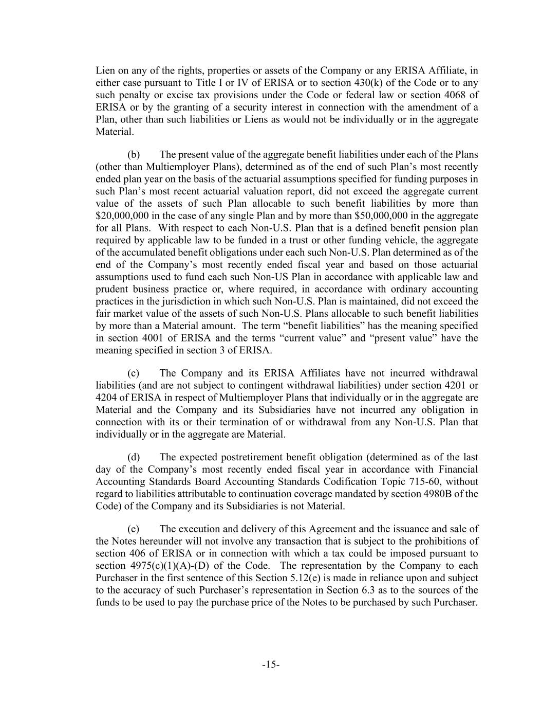 -15- Lien on any of the rights, properties or assets of the Company or any ERISA Affiliate, in either case pursuant to Title I or IV of ERISA or to section 430(k) of the Code or to any such penalty or excise tax provisions under the Code or federal law or section 4068 of ERISA or by the granting of a security interest in connection with the amendment of a Plan, other than such liabilities or Liens as would not be individually or in the aggregate Material. (b) The present value of the aggregate benefit liabilities under each of the Plans (other than Multiemployer Plans), determined as of the end of such Plan’s most recently ended plan year on the basis of the actuarial assumptions specified for funding purposes in such Plan’s most recent actuarial valuation report, did not exceed the aggregate current value of the assets of such Plan allocable to such benefit liabilities by more than $20,000,000 in the case of any single Plan and by more than $50,000,000 in the aggregate for all Plans. With respect to each Non-U.S. Plan that is a defined benefit pension plan required by applicable law to be funded in a trust or other funding vehicle, the aggregate of the accumulated benefit obligations under each such Non-U.S. Plan determined as of the end of the Company’s most recently ended fiscal year and based on those actuarial assumptions used to fund each such Non-US Plan in accordance with applicable law and prudent business practice or, where required, in accordance with ordinary accounting practices in the jurisdiction in which such Non-U.S. Plan is maintained, did not exceed the fair market value of the assets of such Non-U.S. Plans allocable to such benefit liabilities by more than a Material amount. The term “benefit liabilities” has the meaning specified in section 4001 of ERISA and the terms “current value” and “present value” have the meaning specified in section 3 of ERISA. (c) The Company and its ERISA Affiliates have not incurred withdrawal liabilities (and are not subject to contingent withdrawal liabilities) under section 4201 or 4204 of ERISA in respect of Multiemployer Plans that individually or in the aggregate are Material and the Company and its Subsidiaries have not incurred any obligation in connection with its or their termination of or withdrawal from any Non-U.S. Plan that individually or in the aggregate are Material. (d) The expected postretirement benefit obligation (determined as of the last day of the Company’s most recently ended fiscal year in accordance with Financial Accounting Standards Board Accounting Standards Codification Topic 715-60, without regard to liabilities attributable to continuation coverage mandated by section 4980B of the Code) of the Company and its Subsidiaries is not Material. (e) The execution and delivery of this Agreement and the issuance and sale of the Notes hereunder will not involve any transaction that is subject to the prohibitions of section 406 of ERISA or in connection with which a tax could be imposed pursuant to section 4975(c)(1)(A)-(D) of the Code. The representation by the Company to each Purchaser in the first sentence of this Section 5.12(e) is made in reliance upon and subject to the accuracy of such Purchaser’s representation in Section 6.3 as to the sources of the funds to be used to pay the purchase price of the Notes to be purchased by such Purchaser.